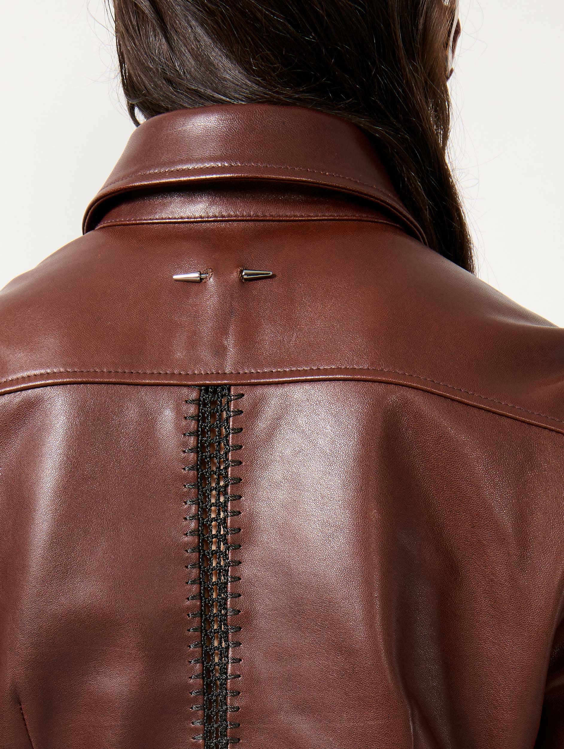 Réalisée dans un cuir d'agneau plongé dans une élégante teinte marron, cette chemise non doublée se porte à la taille, glissée dans une jupe, ou légèrement surtaillée en veste ou surchemise portée ouverte sur un top de la collection. Au dos et sur les côtés, elle révèle un élégant travail de macramé réalisé au fil noir. Au dos, le piercing en métal argenté, signature de la Maison. Dotée de poignets boutonnés, cette chemise en cuir est une déclaration de style et un intemporel à chérir saison après saison.