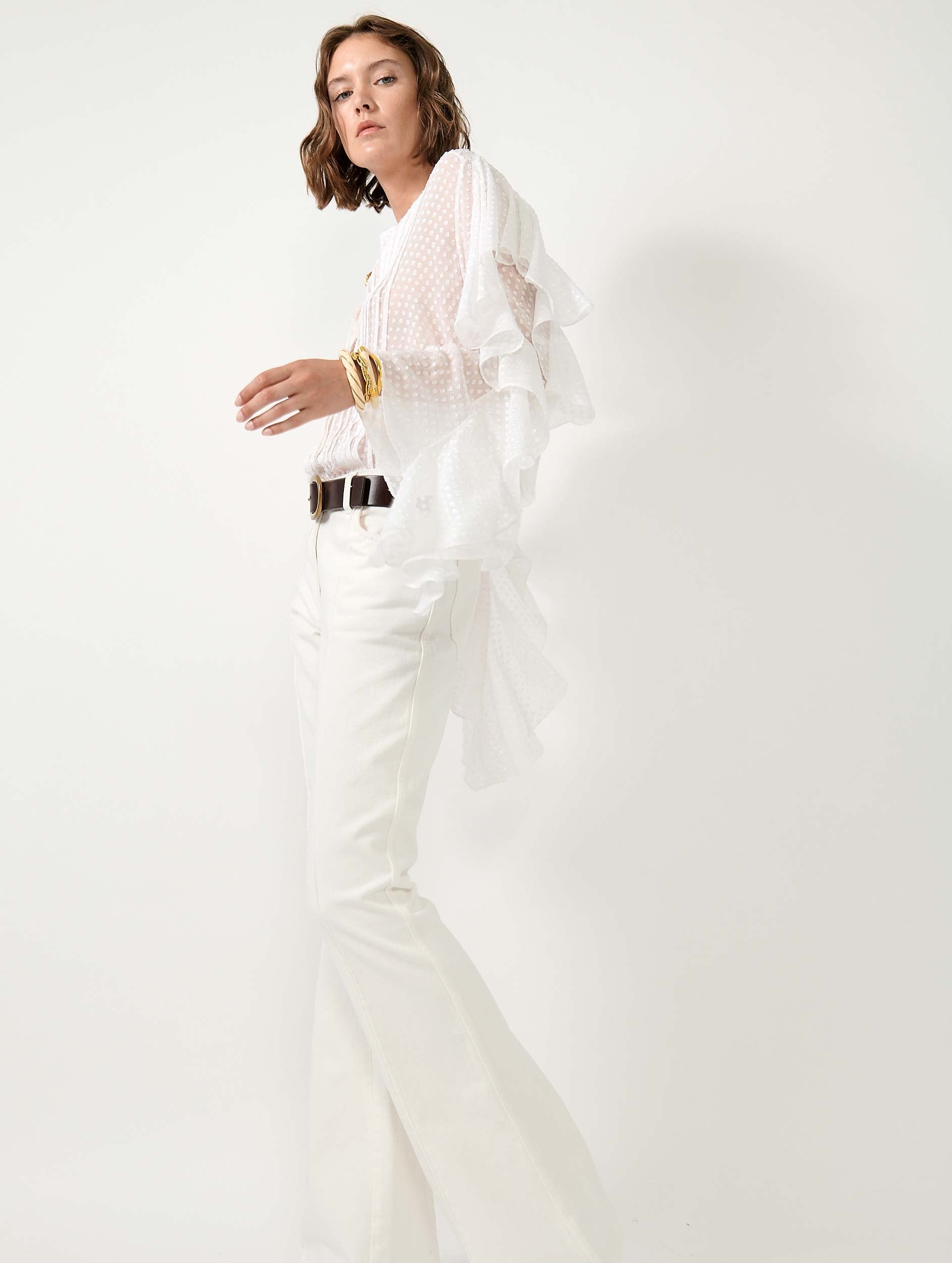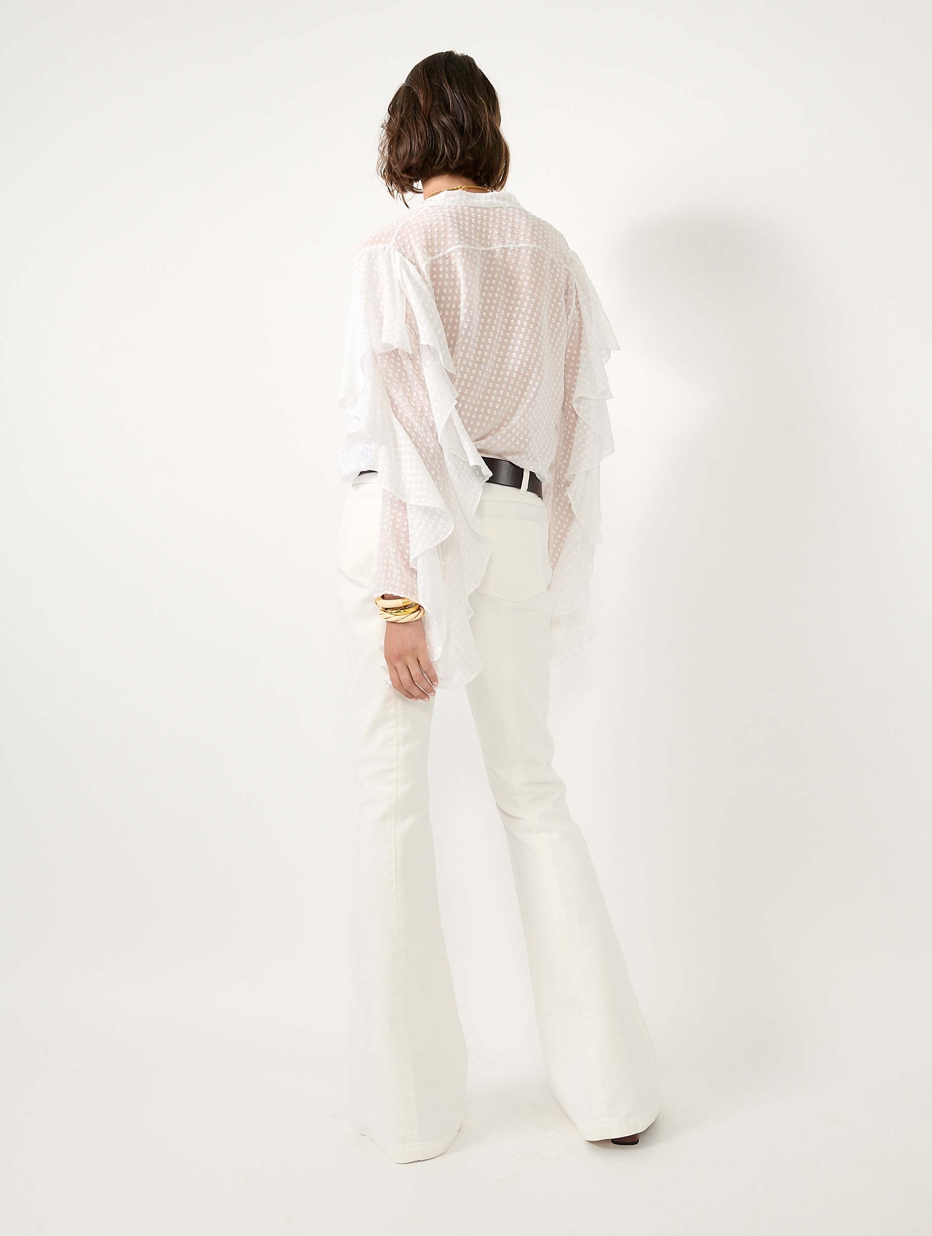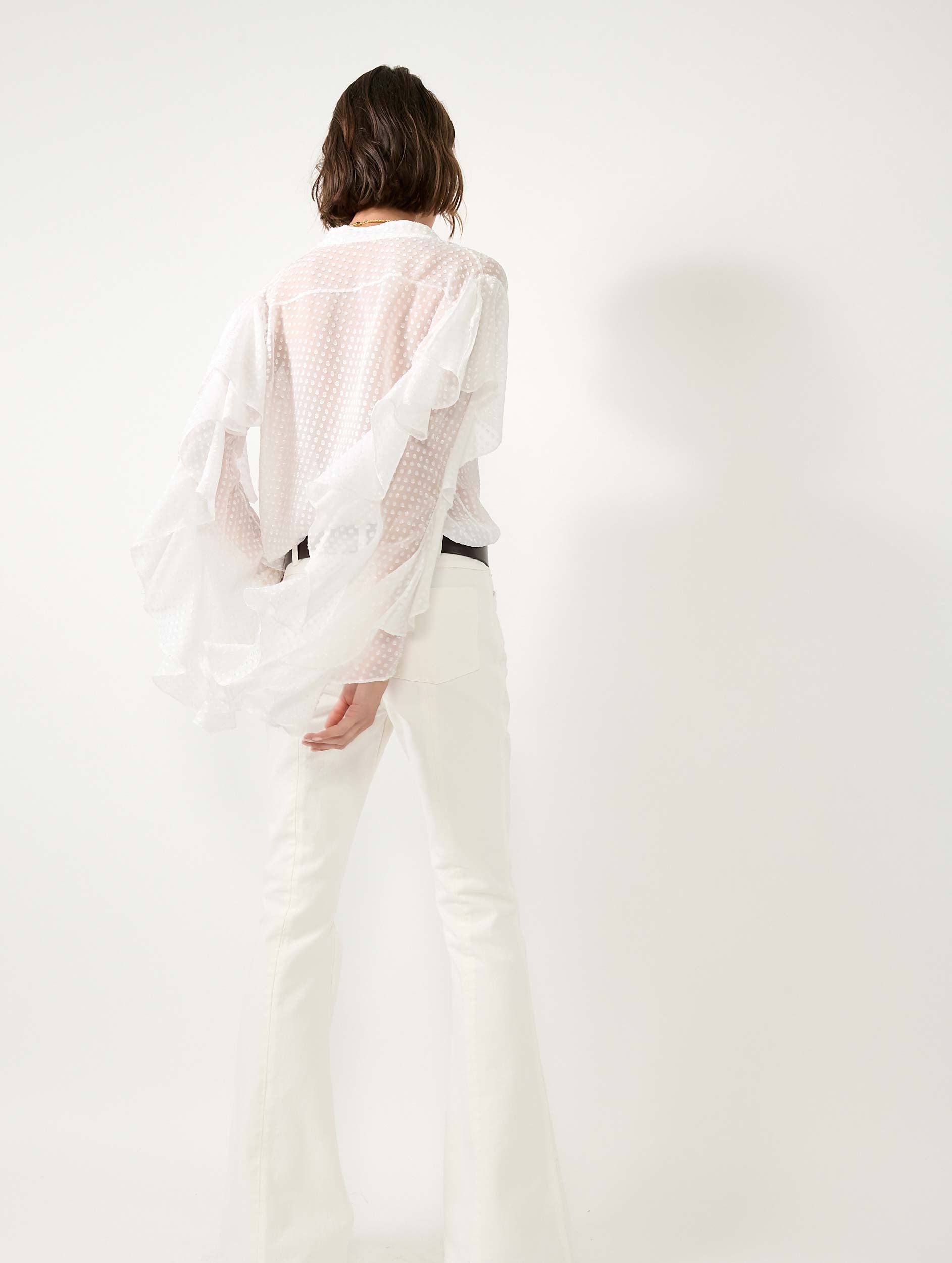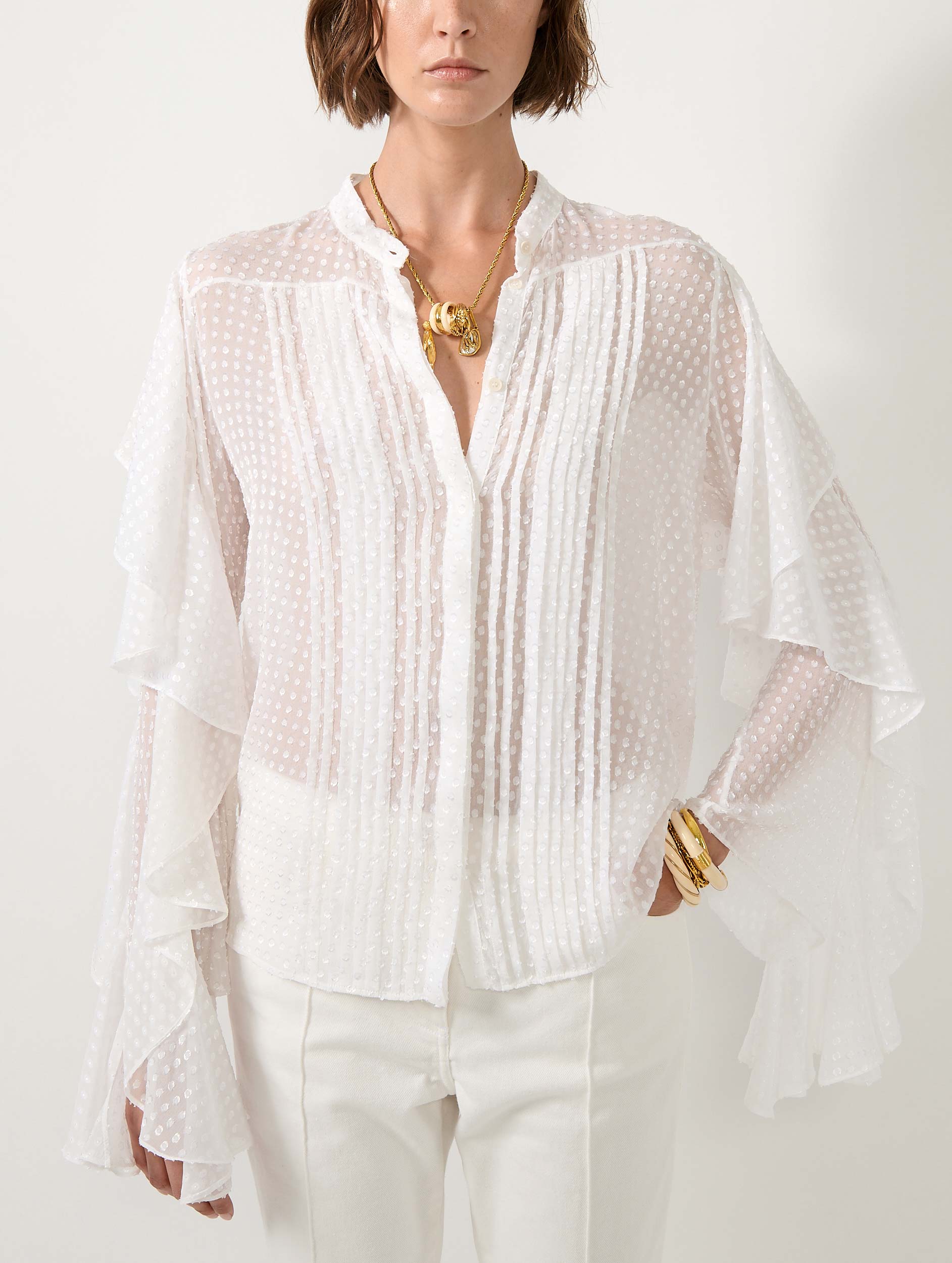 Les manches volantées de cette chemise en soie plumetis soulignent sa féminité. Elle se porte seule ou sous l'une de nos vestes de costume aux manches zippées laissées ouvertes. Le plastron de cette blouse est orné d'un travail de plissé raffiné. En blanc ou bleu ciel, ce haut s'anime avec élégance en suivant le rythme de vos mouvements.