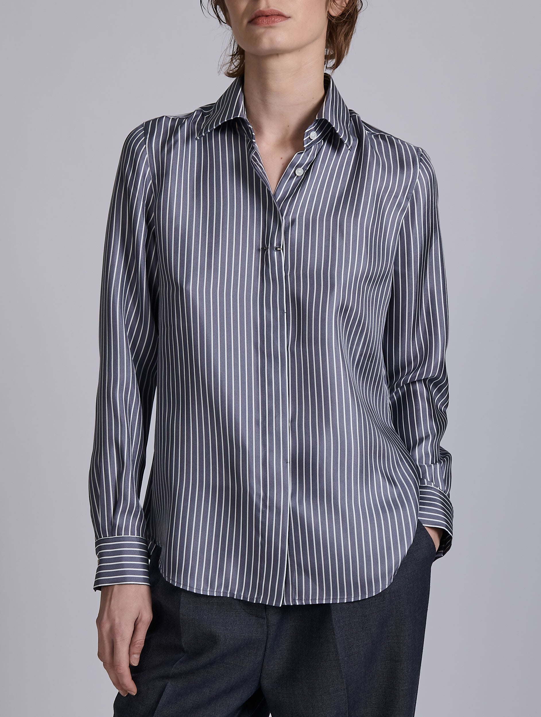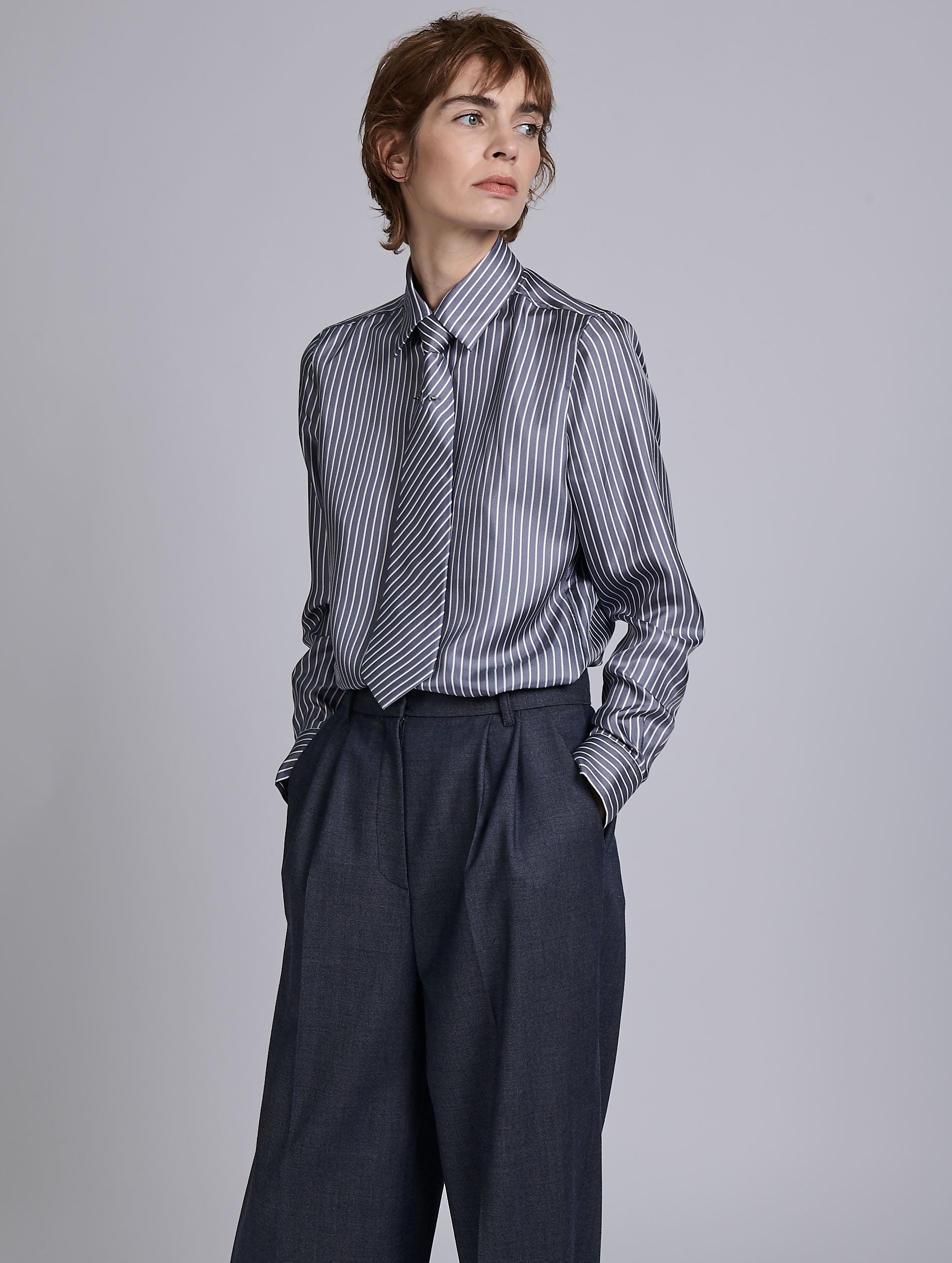 La chemise en soie est également déclinée dans cet élégant twill de soie à rayures grises et blanches dans une étoffe légèrement plus texturée. Ses poignets boutonnés assurent un tombé impeccable à cette chemise droite et épurée dotée d'un col classique et d'une patte de boutonnage cachée. Si elle évoque les costumes masculins, cette chemise rayée s'accessoirise de notre bijou piercing en métal argent : une touche rock fidèle au mélange des genres et influences cher à Barbara Bui. Pour un business look revisité aux accents androgynes, portez sur cette chemise la cravate en twill de soie assortie.