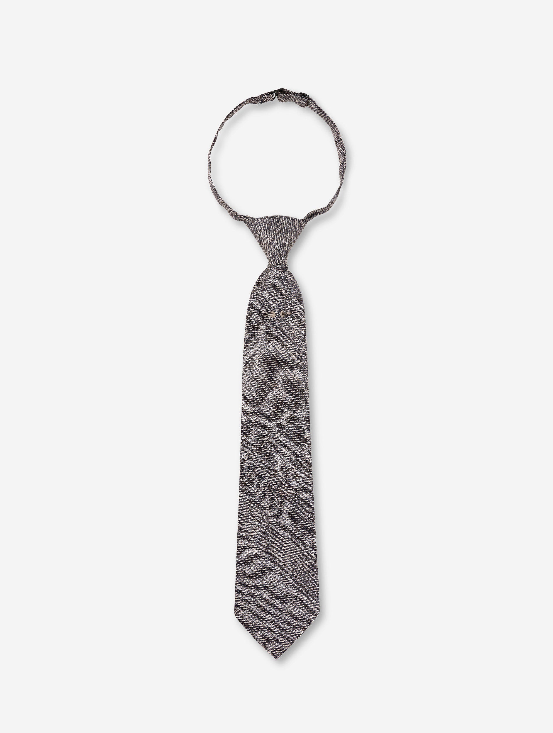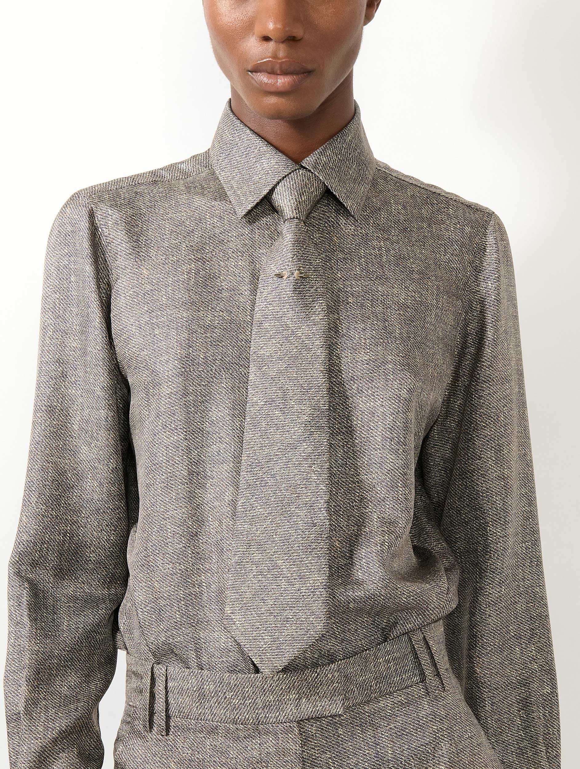 Barbara Bui s'empare de la cravate, accessoire conférant immédiatement une attitude, twisté cette saison dans un esprit tailoring affirmé. Confectionnée en soie imprimée à l’effet tissage trompe-l'œil, cet accessoire joue les faux classiques avec ce qu'il faut d’impertinence. Montée sur une attache collier et déjà nouée pour une tenue parfaite, cette cravate femme s’associe naturellement à la chemise et au costume assortis. Son piercing en métal argenté, signature de la Maison, ponctue la silhouette d’un éclat rock.