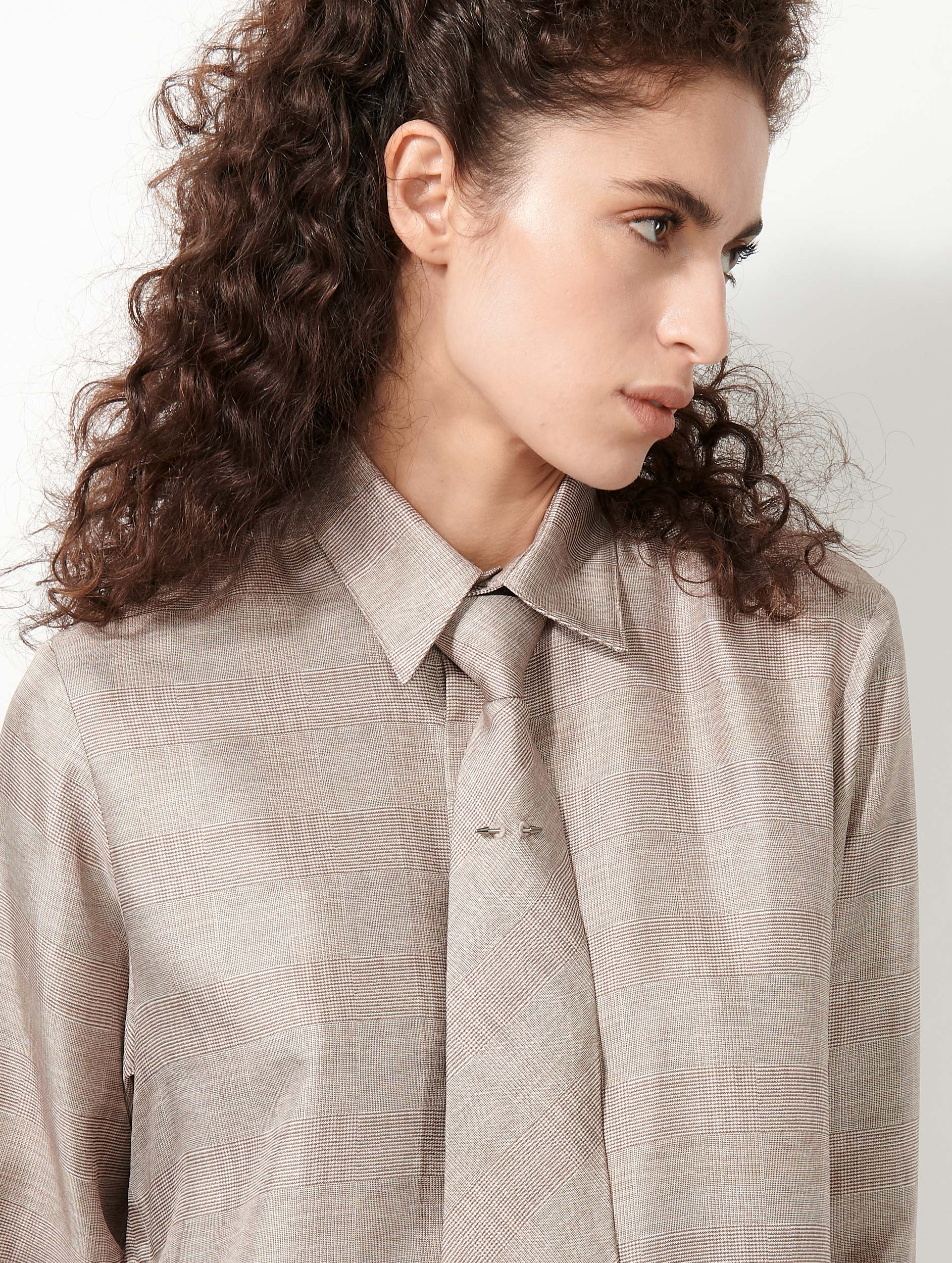 Cette cravate pour femme est réalisée dans un twill de soie au motif prince de Galles. Légère et facile à adopter grâce à son collier à attache prémontée et son nœud déjà réalisé, cette cravate est la touche finale d'une silhouette masculin-féminin, portée sur la chemise dans la même matière. Piercing en métal argenté signature de la Maison.