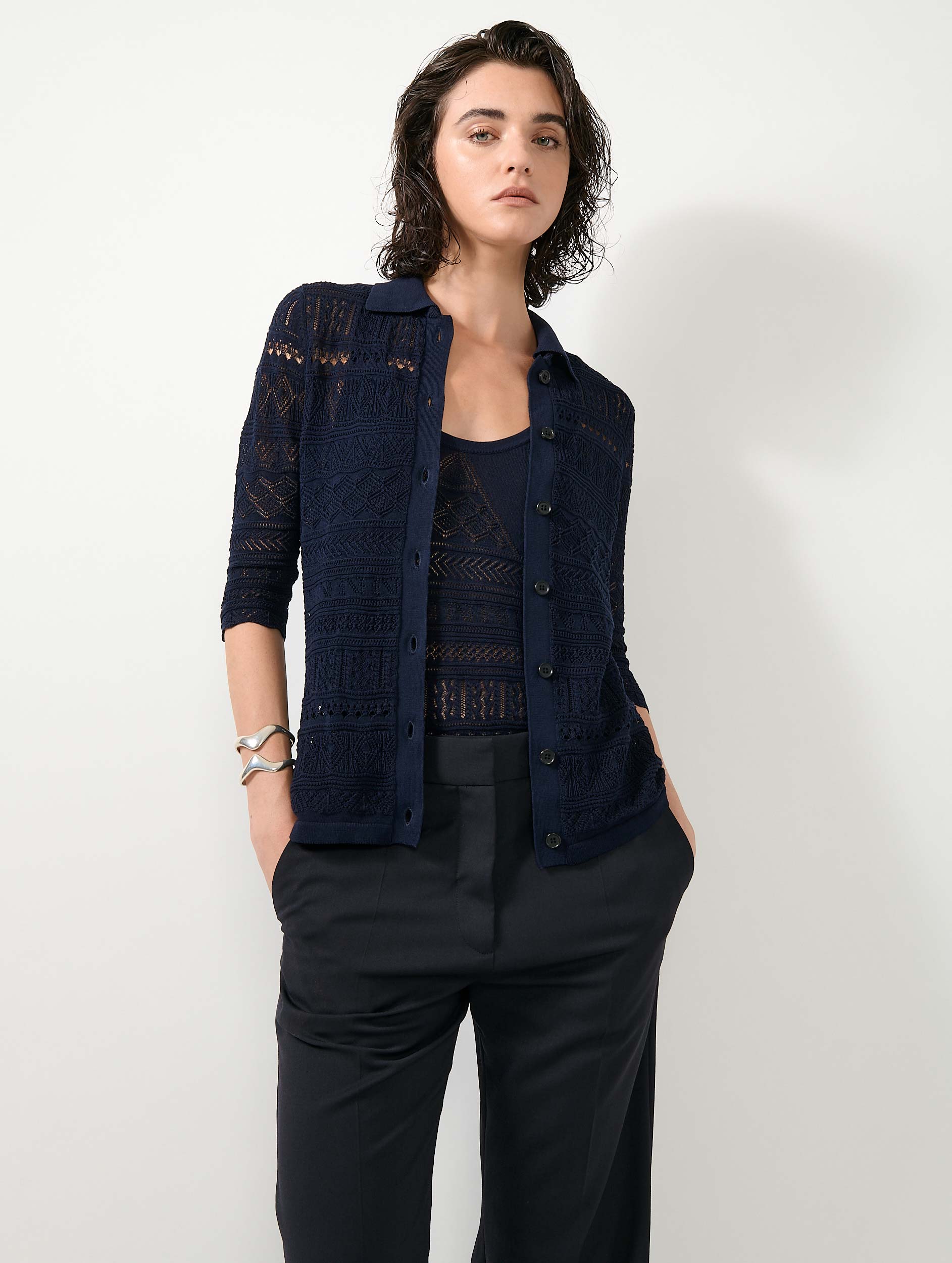 Ce haut féminin en maille ajourée aux motifs géométriques en relief joue élégamment sur les effets de transparence tout en assurant un porter confortable grâce à l'opacité de la maille au niveau de la poitrine. Le travail de tricotage alterne des points fantaisie, évoquant à la fois des chevrons, des dentelles graphiques et des bandes texturées, dans un esprit à la fois artisanal et sophistiqué. Proposé dans les trois coloris coordonnés au pull assorti, ce débardeur en maille peut se porter en twin-set pour l'entrée de saison ou une soirée d'été. De dos, se révèle tout le savoir-faire des ateliers de la Maison.