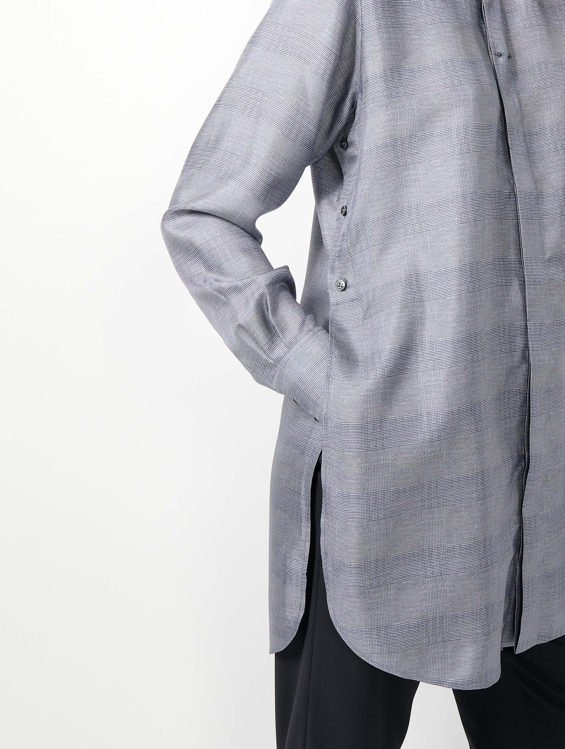 D'apparence classique, cette chemise femme comporte une patte de boutonnage le long des manches ainsi que sur les côtés, un détail qui permet de la porter de manière structurée ou plus décontractée en glissant librement les mains dans les poches d'un pantalon. Elle est réalisée dans un twill de soie au motif prince de Galles subtil dans ses tonalités bleues ou beige. Détournez les codes du vestiaire sartorial masculin en lui associant sa cravate assortie pour parfaire votre silhouette.
