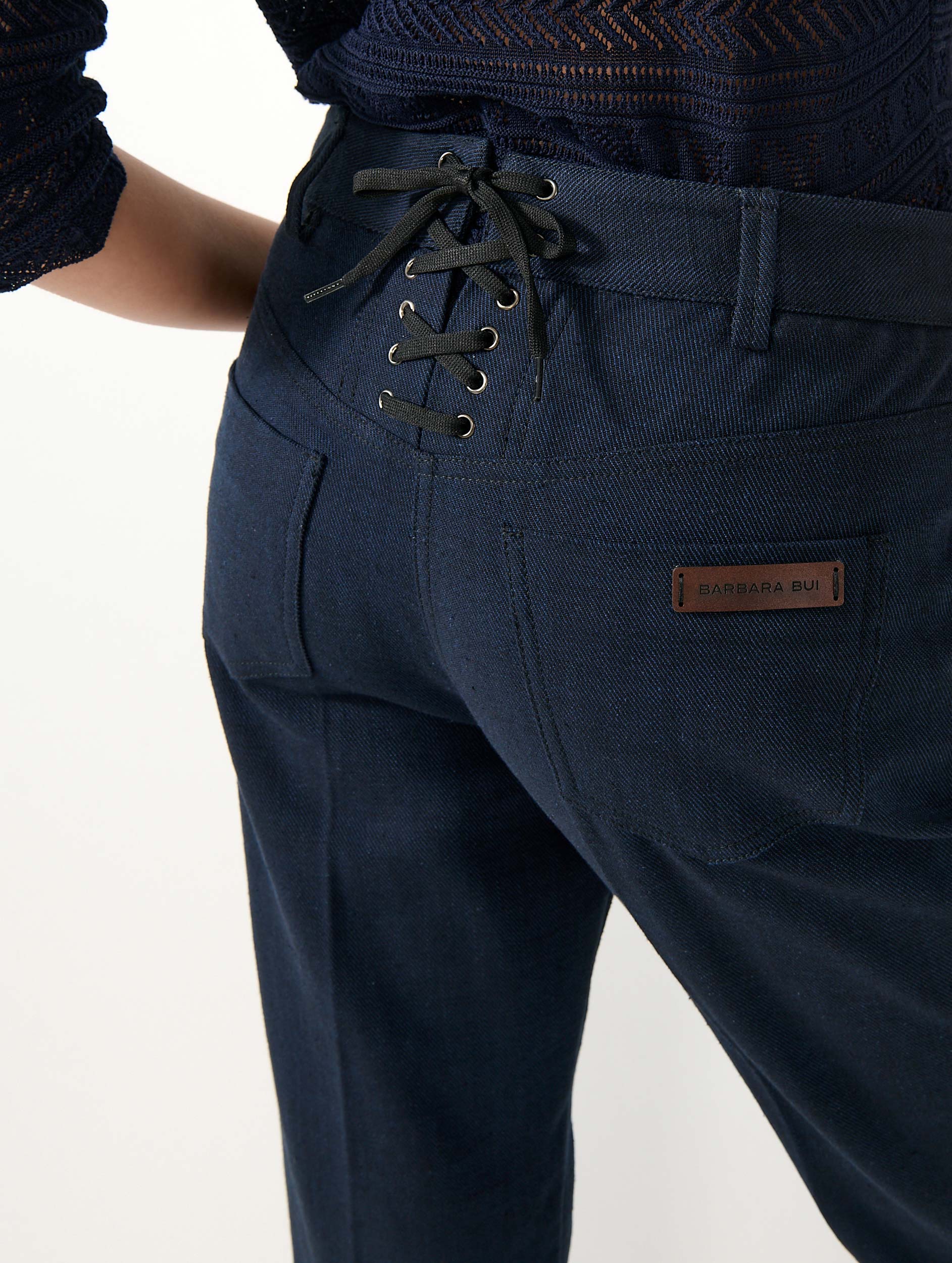 Revisité dans une longueur 7/8 idéale pour le printemps-été, le pantalon bootleg se fait plus féminin que jamais doté de découpes seyantes et d'un détail de laçage croisé à l'arrière. À l'avant ses finitions épurées, poches arrondies, montage costume et pli marqué, promettent une silhouette minimaliste élancée. Porté avec une paire de sandales à talons et un haut en broderie anglaise, ce pantalon en sergé de coton texturé, offert en navy ou en gris, promet une allure croisière adaptée à vos prochaines escapades.