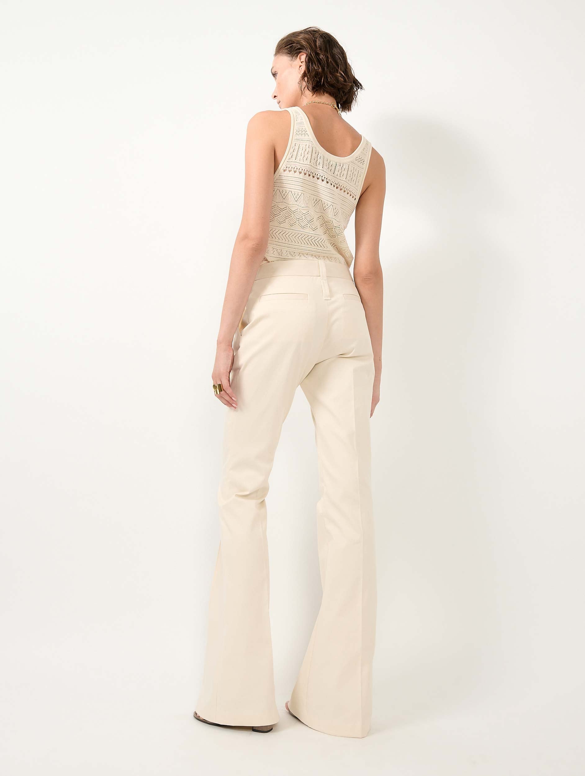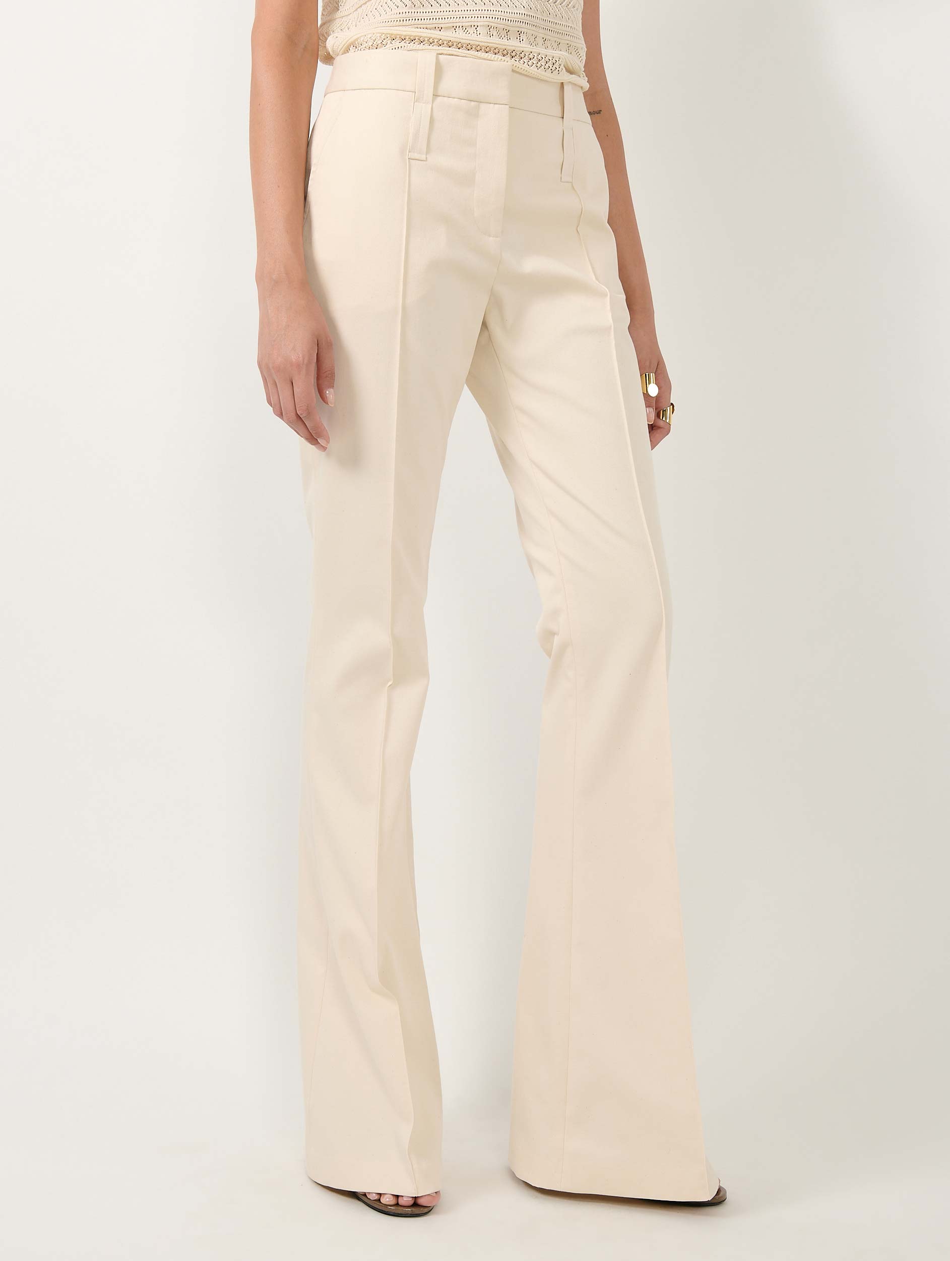 Ici, l'accent est mis sur la coupe sharp de ce pantalon bootleg seyant. Réalisé dans un coton stretch dans un coloris sable lumineux, ce pantalon dispose d'un pli cousu le long de la jambe, un détail soigné qui, couplé à sa coupe bootleg affirmée, élance la silhouette. Autre détail ajoutant au caractère de cet intemporel : un double jeu de passants met en valeur la taille montée de ce modèle et l'attention portée à chaque détail de sa construction.