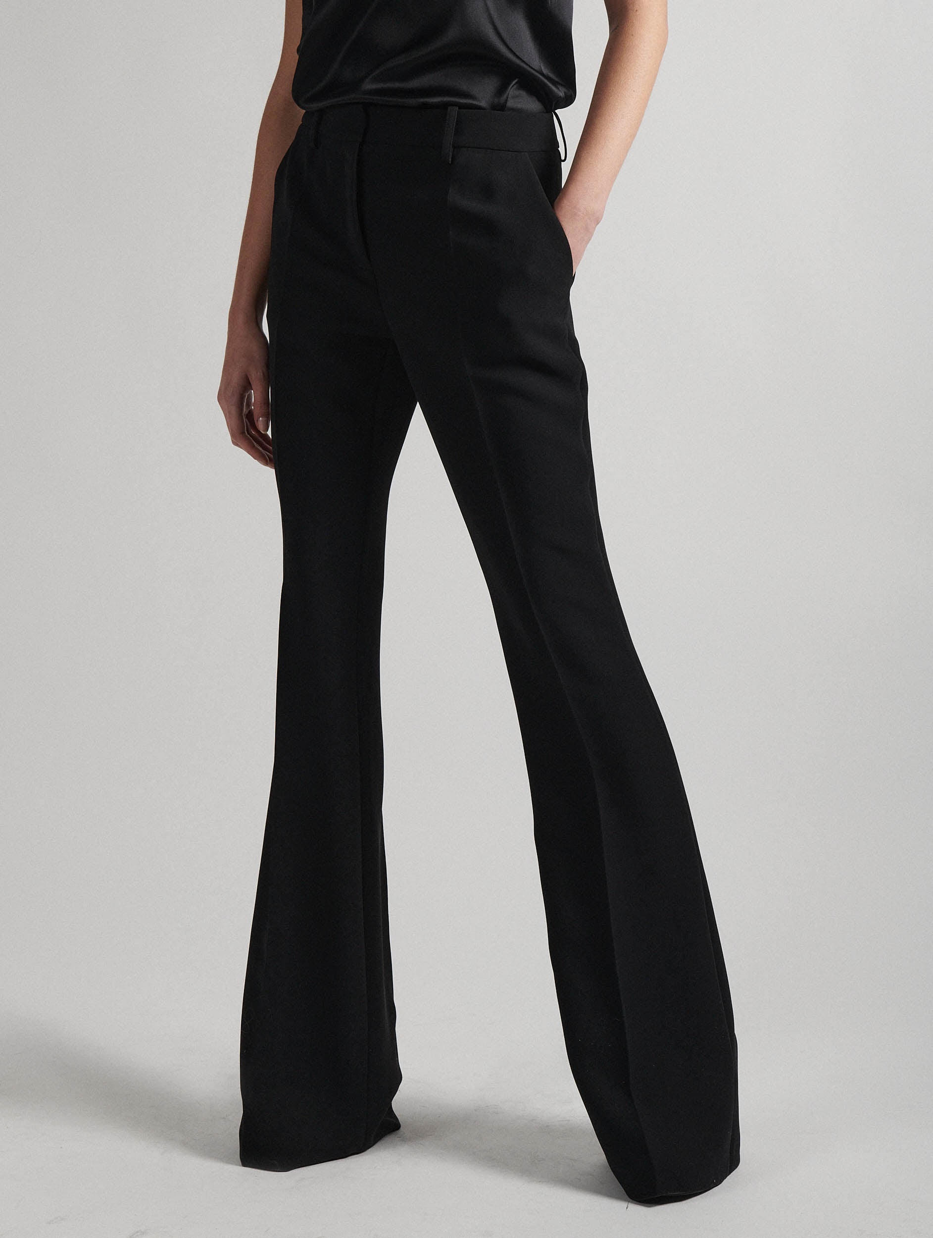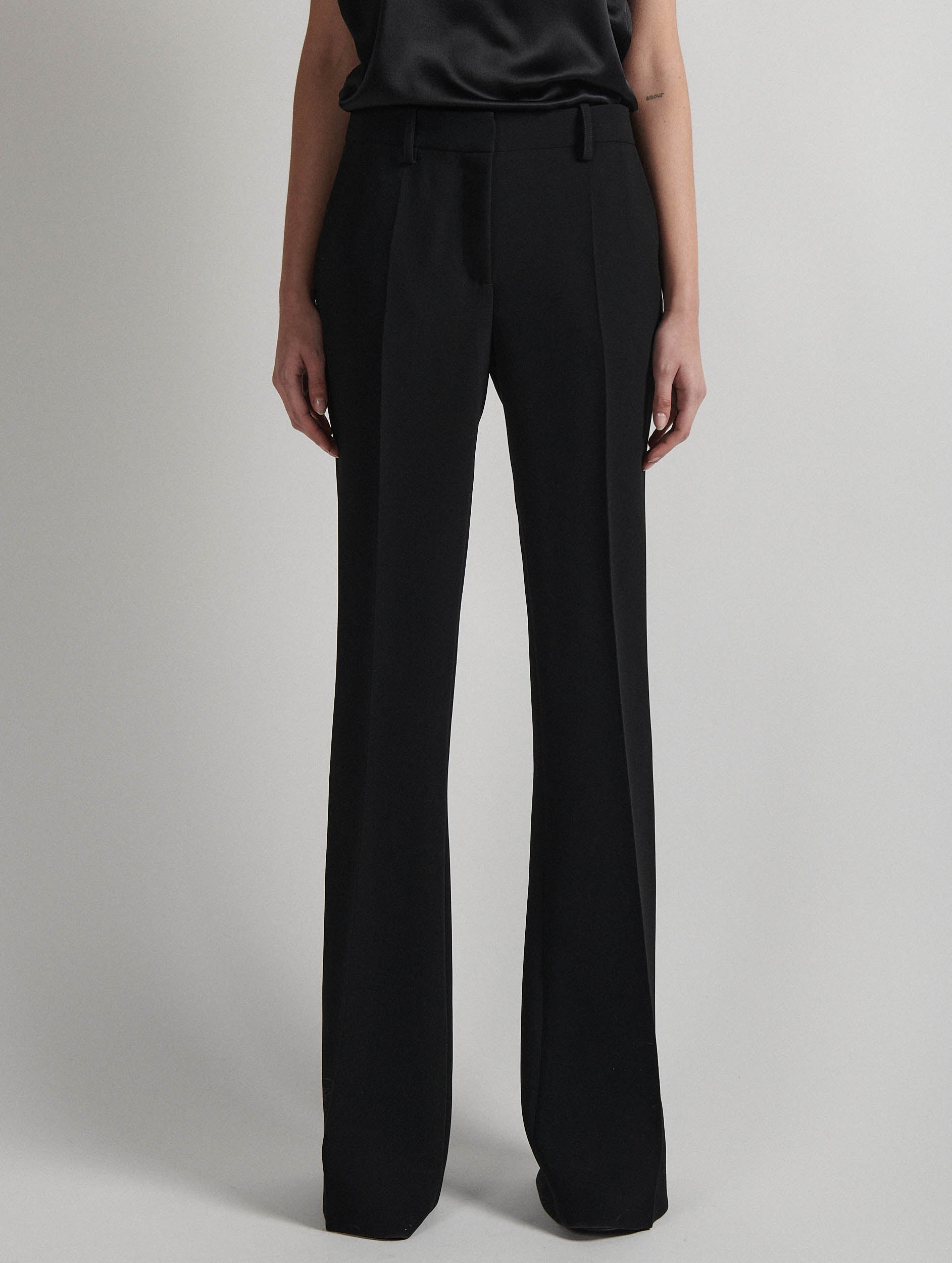 Ce pantalon femme en crêpe fluide vous assure de faire sensation. Sa coupe bootleg, évasée sur le bas de la jambe, élance la silhouette, offrant une allure sculpturale, adaptée à toutes les morphologies. Ses détails soignés, tels que les poches italiennes, les passants à la taille et les poches arrière soulignées d'un passepoil, mettent en valeur l'expertise de la Maison en matière de coupe et confection tailleur. Pour un look costume, associez ce pantalon à la veste à manches zippées dans le même crêpe fluide et notre chemise en satin de soie avec lavallière.
