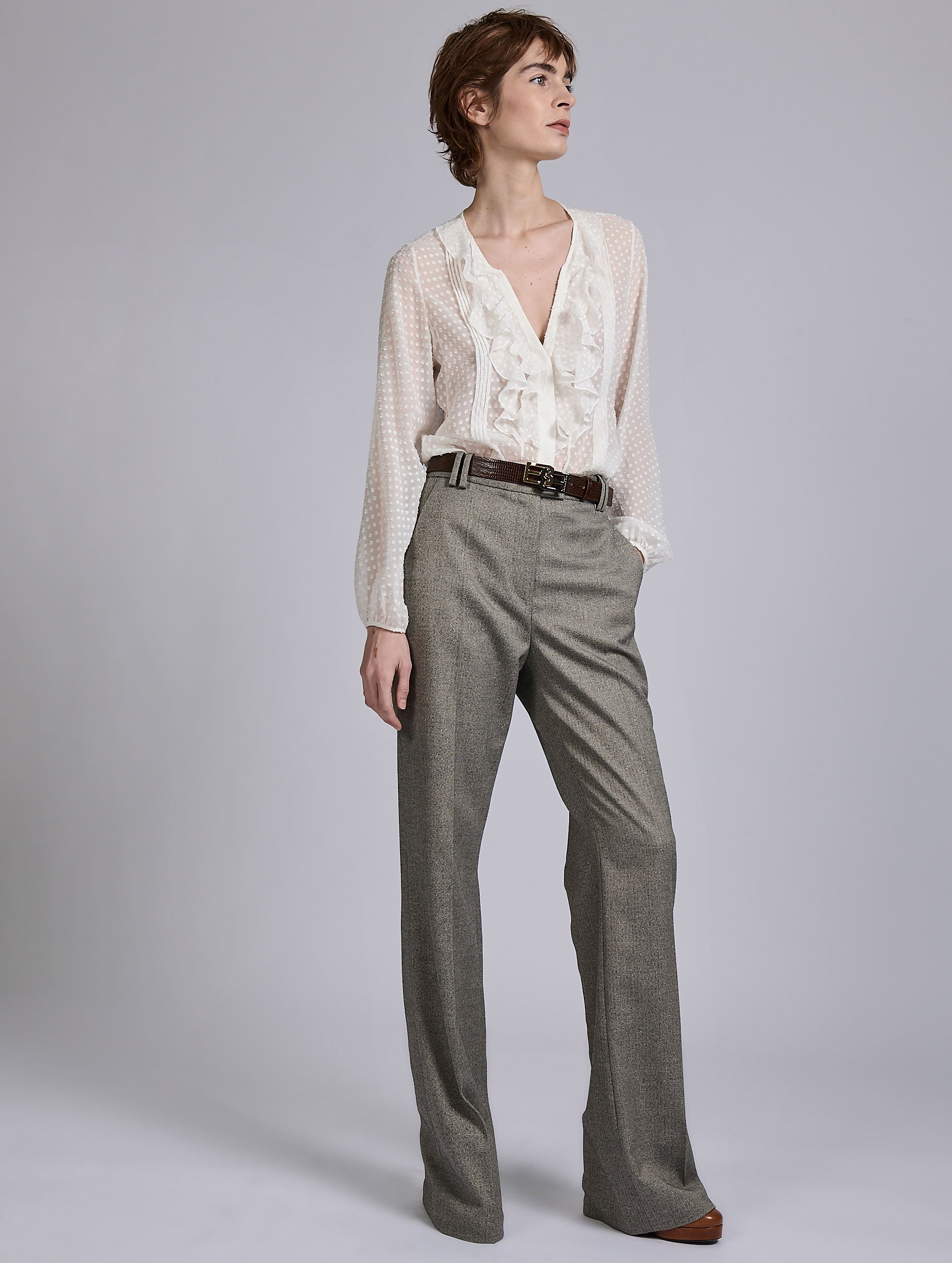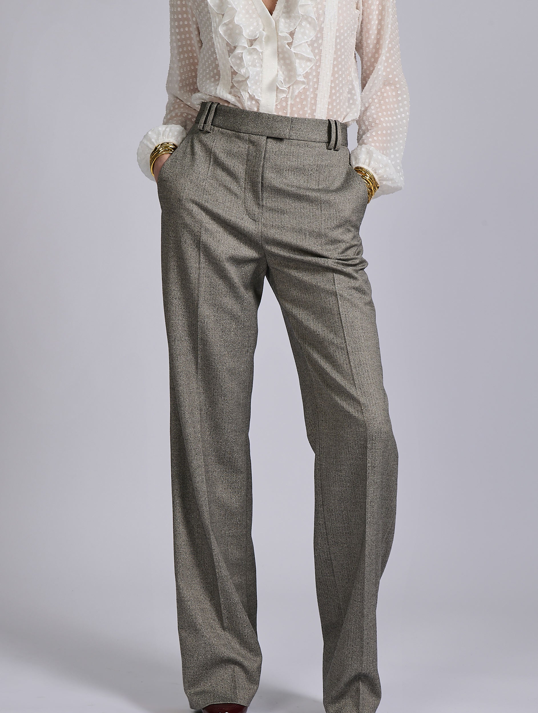 Pour une attitude décontractée en toute élégance, Barbara Bui a associé une étoffe grise à micro-motifs chevrons lurex à une coupe taille haute à jambes larges. Porté en costume-trois-pièces féminisé avec le gilet de costume et la veste coordonnés, ou simplement avec une blouse féminine, ce pantalon femme se prête à toutes les occasions. Un pli marqué le long de la jambe ajoute à la structure de ce modèle aux finitions soignées, comme son double jeu de passants permettant d'y glisser la ceinture de votre choix.