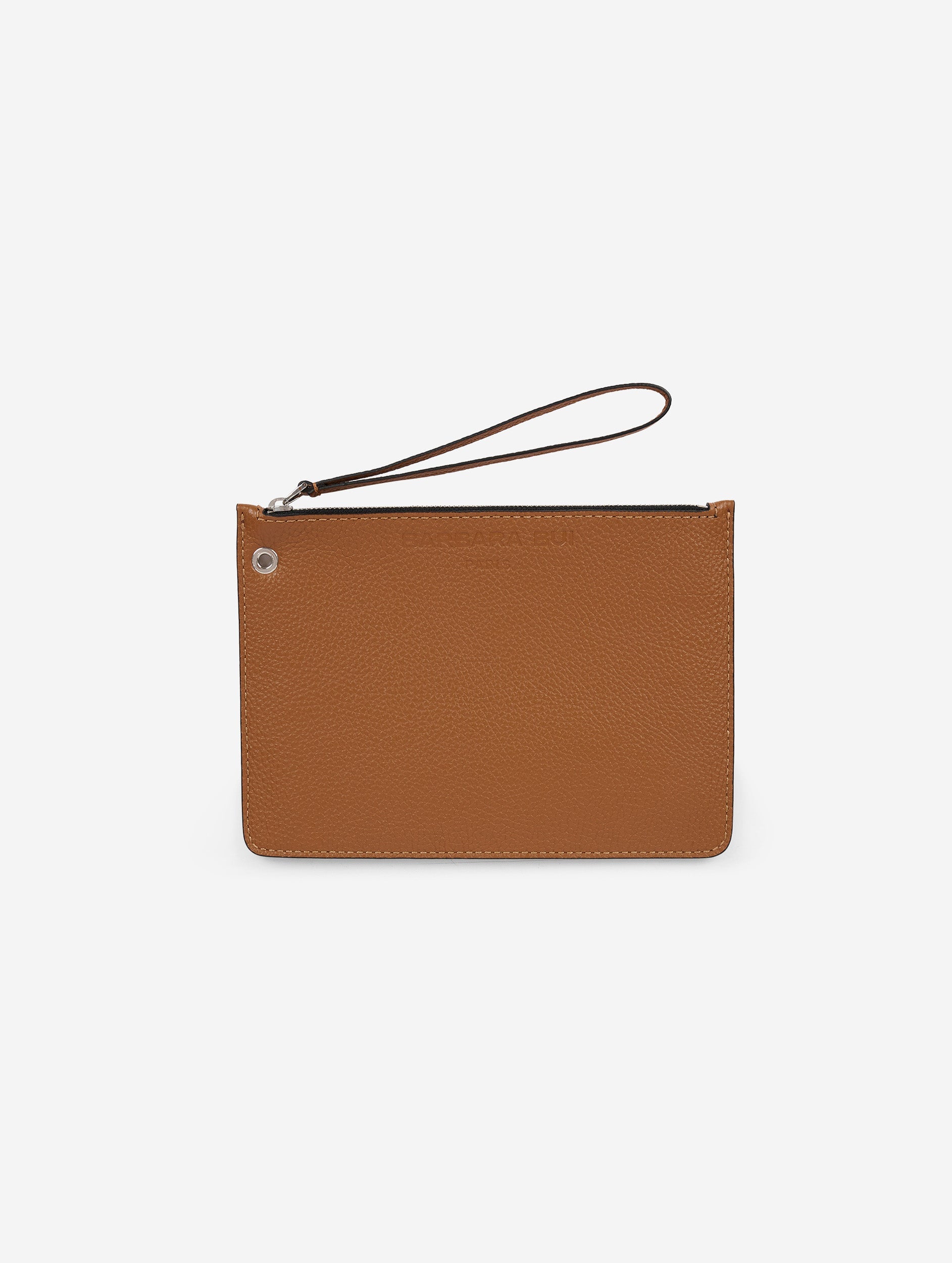 Pochette zippée en veau grainé caramel contrecollé sur sa doublure effet réversible. Tire-zip dragonne, et œillet permettant de l'accrocher au mousqueton intérieur des sacs "TO B." et "B. FORE" ou d'y accrocher ses clés à l'aide d'un mousqueton (non fourni) par exemple.