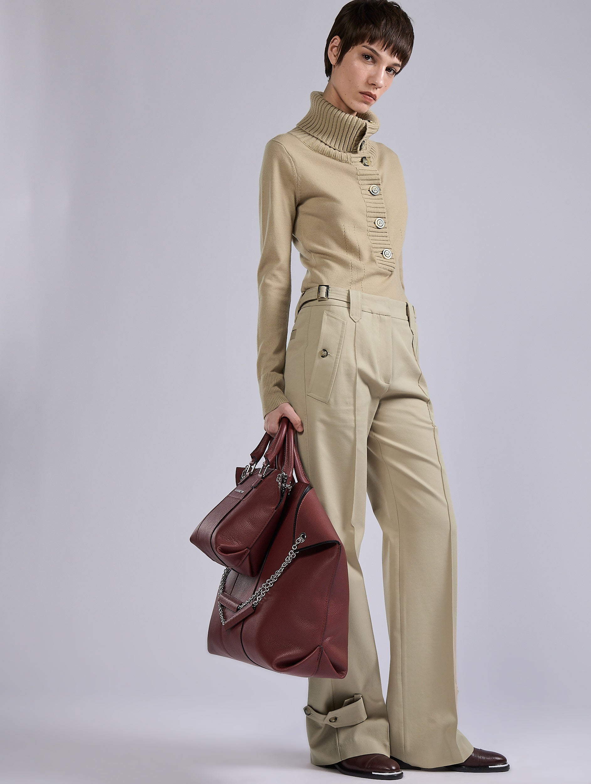 Ce pull en maille mérinos au volume inspiré des gros pulls d'hiver en propose une réinterprétation plus légère agrémentée d'un col et d'une patte de boutonnage côtelés pour un élégant effet de textures. Ce modèle versatile, boutonné de la poitrine jusqu'en haut du col, peut se porter en col roulé ou son col ouvert grâce à ses deux boutons. À l'avant comme au dos, des jeux d'échelle raffinés ajoutent à la féminité de ce pull femme offert en laine mérinos noire, bleu denim ou sable. Si nos jeans s'y accordent parfaitement, ce modèle est du plus bel effet porté avec l'un de nos pantalons en gabardine ponctué de détails empruntés au trench-coat.