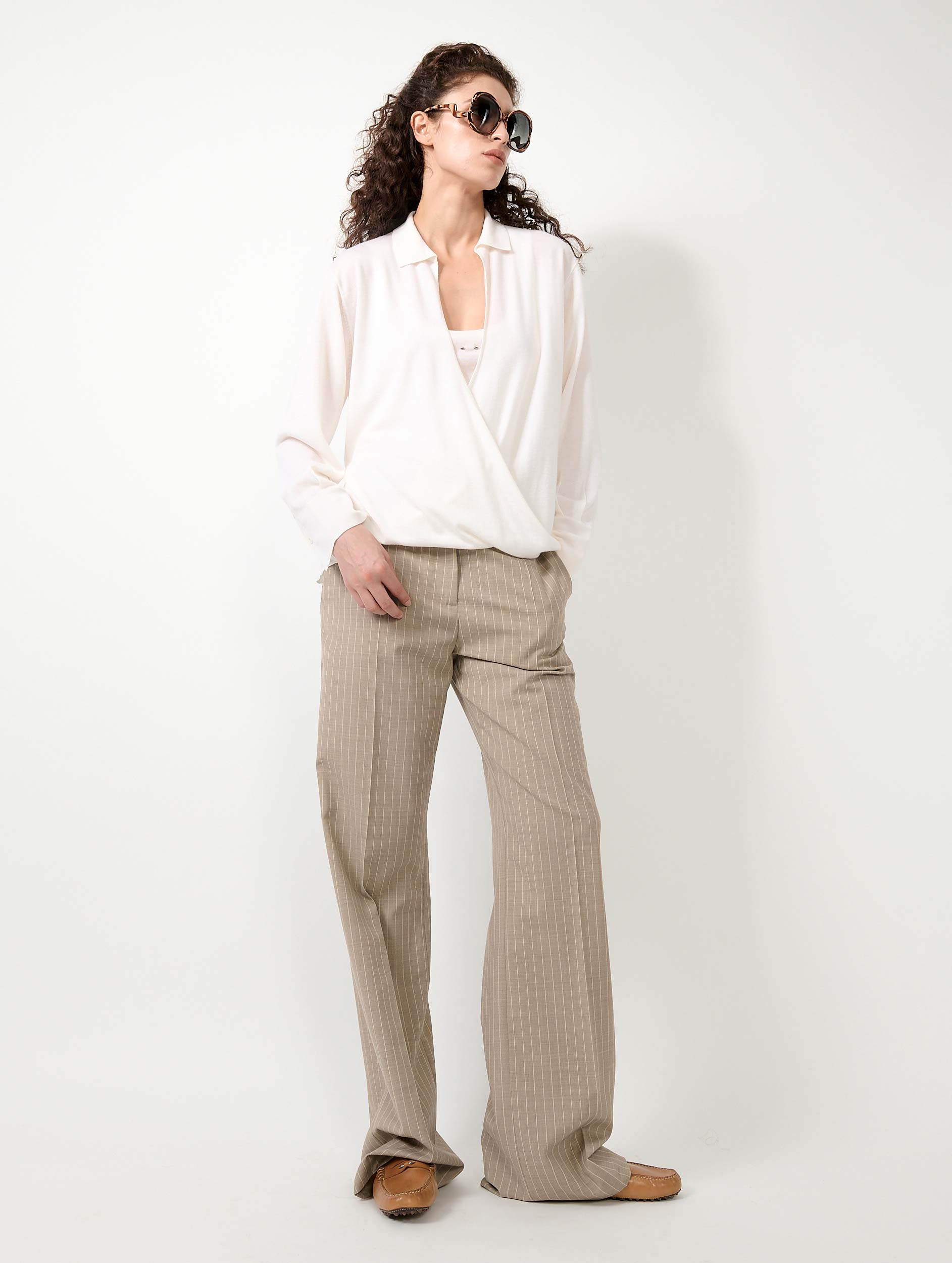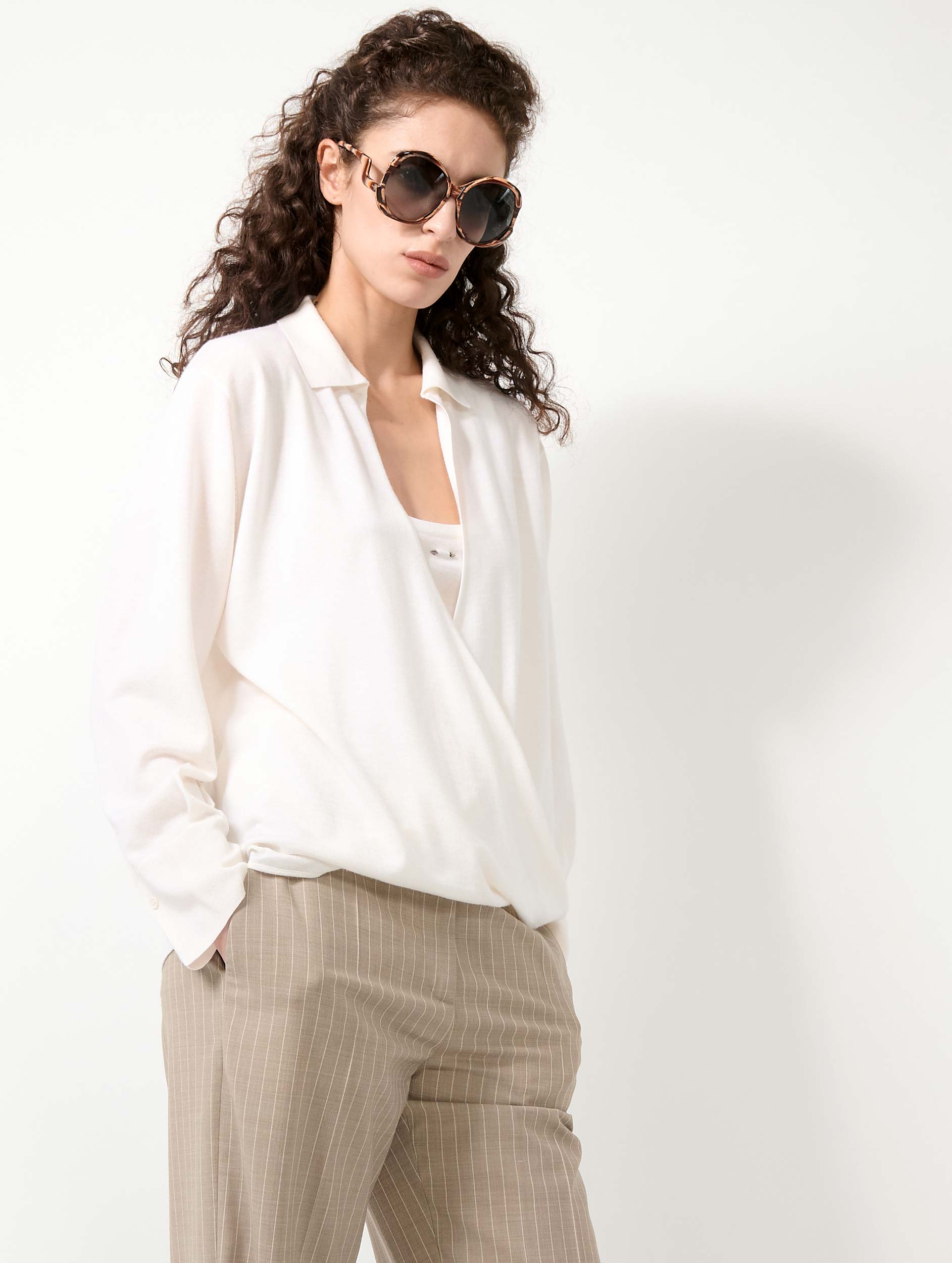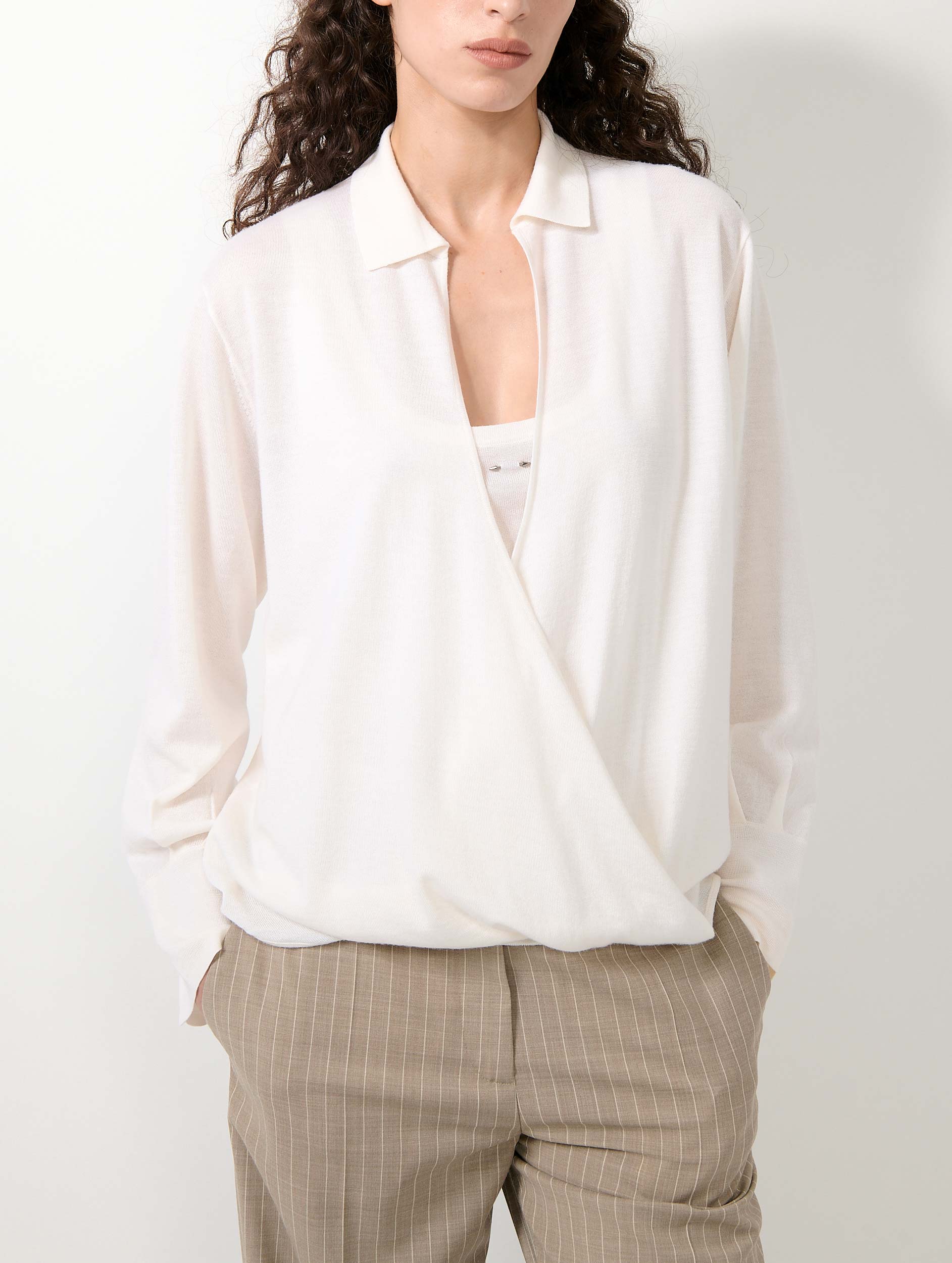 Ce pull en maille mérinos extrafine vous offre une douceur digne de la soie et un porté chaud en toute légèreté. Son encolure cache-cœur croisée est associée à un décolleté profond structuré par élégant col polo. Porté sur la peau ou superposé à une chemise ou un débardeur, ce pull en laine mérinos est un essentiel dont le chic décontracté trouve naturellement sa place dans votre vestiaire de la saison. Cet élégant pull femme intemporel est proposé en coloris ivoire, noir et sable.