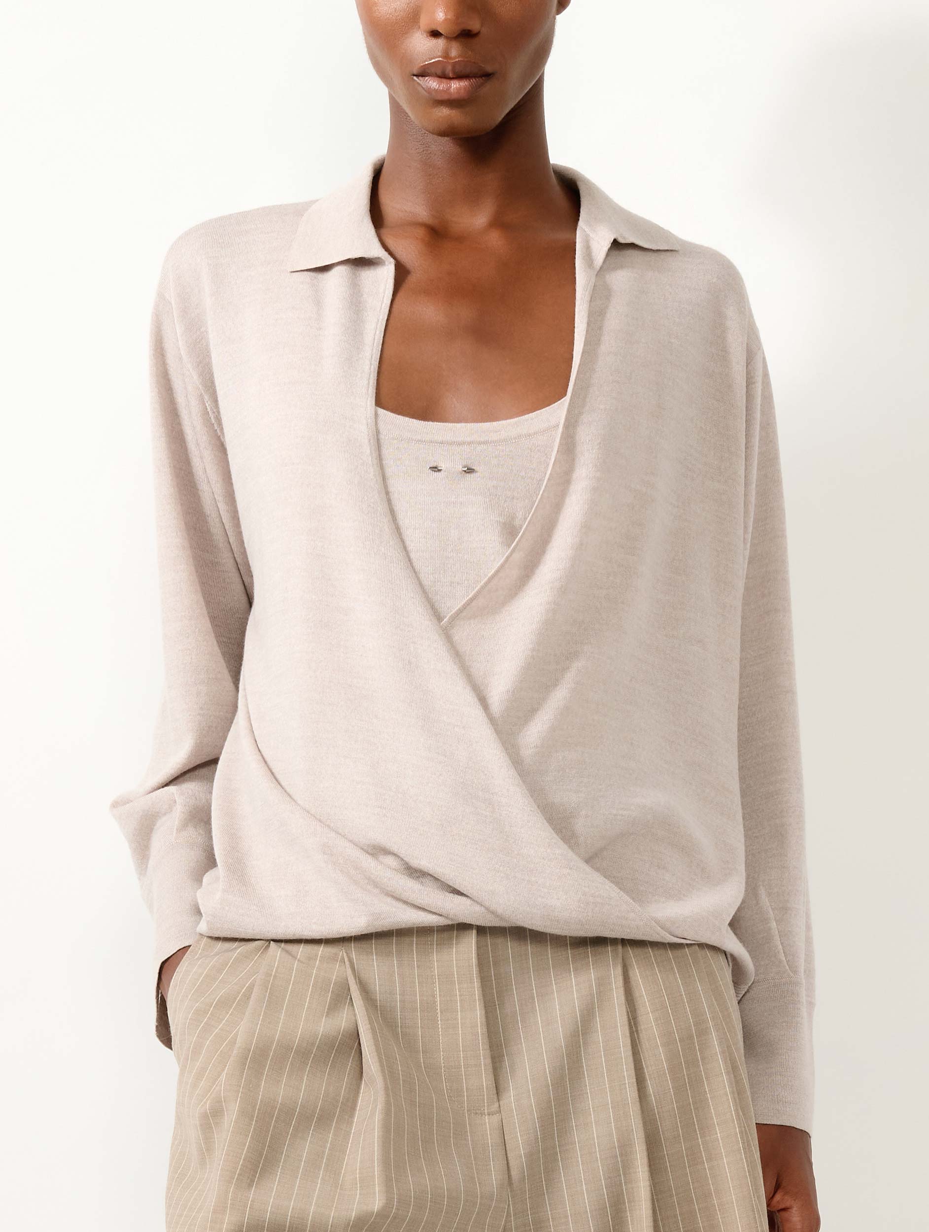 Ce pull en maille mérinos extrafine vous offre une douceur digne de la soie et un porté chaud en toute légèreté. Son encolure cache-cœur croisée est associée à un décolleté profond structuré par élégant col polo. Porté sur la peau ou superposé à une chemise ou un débardeur, ce pull en laine mérinos et soie est un essentiel dont le chic décontracté trouve naturellement sa place dans votre vestiaire de la saison. Cet élégant pull femme intemporel est proposé en coloris ivoire, navy et sable.