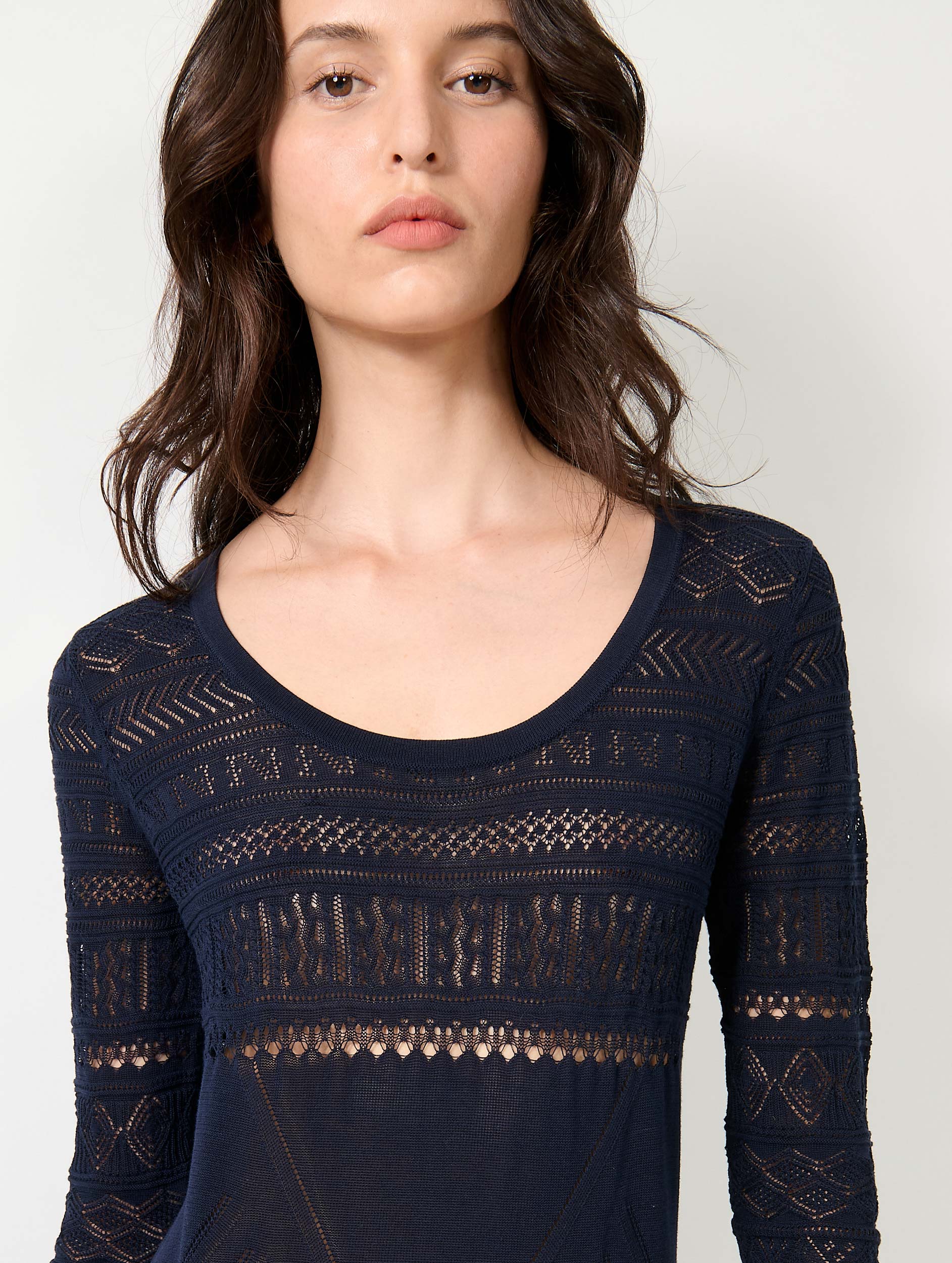 Cette robe longue est réalisée en maille pointelle légère empruntant à la délicatesse d'une dentelle. Le placement de ses motifs formés par la découpe de la maille et ses jeux de diminution sculptent la silhouette pour une allure élégante. Une fente latérale de chaque côté révèle nonchalamment la jambe. Ses manches trois-quarts sont festonnées, un détail raffiné ajoutant à la féminité de cet intemporel.