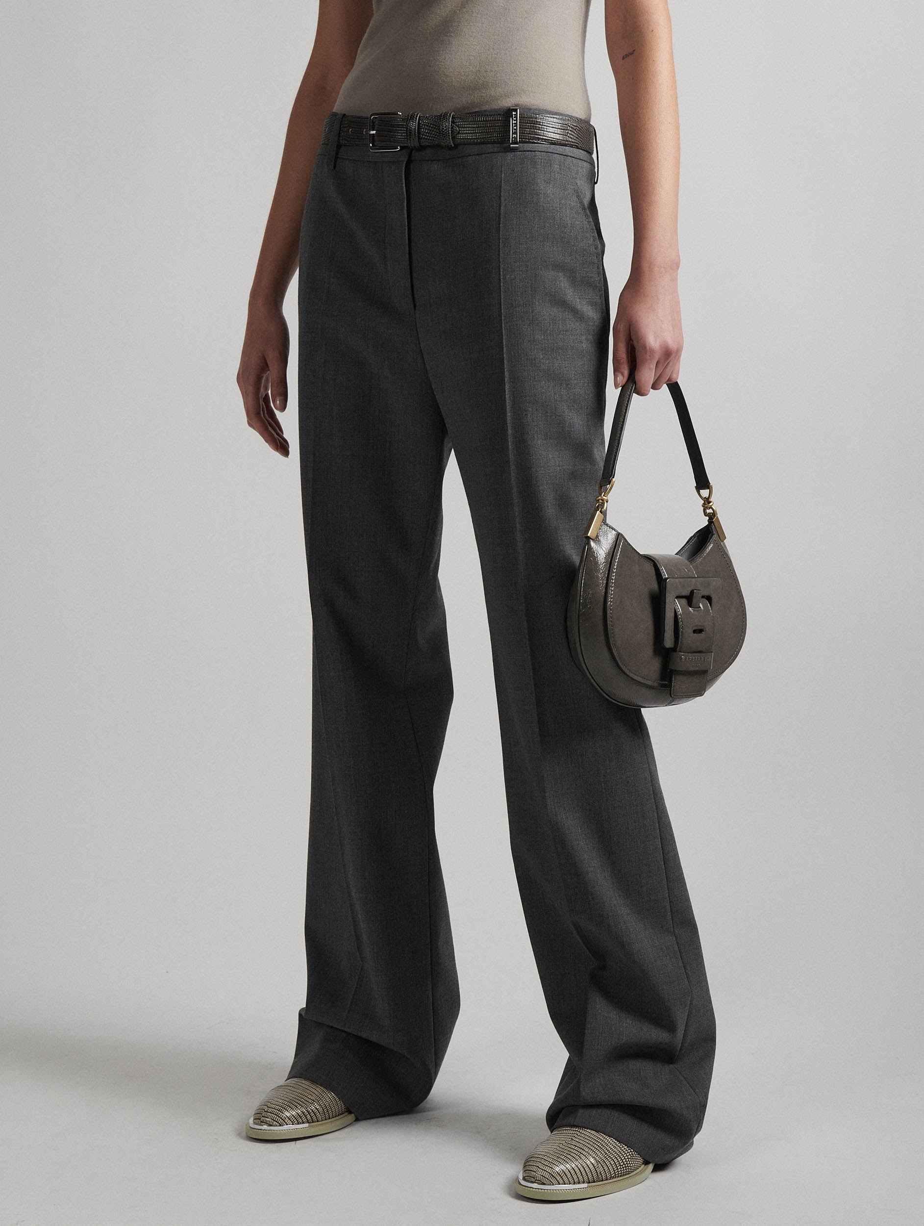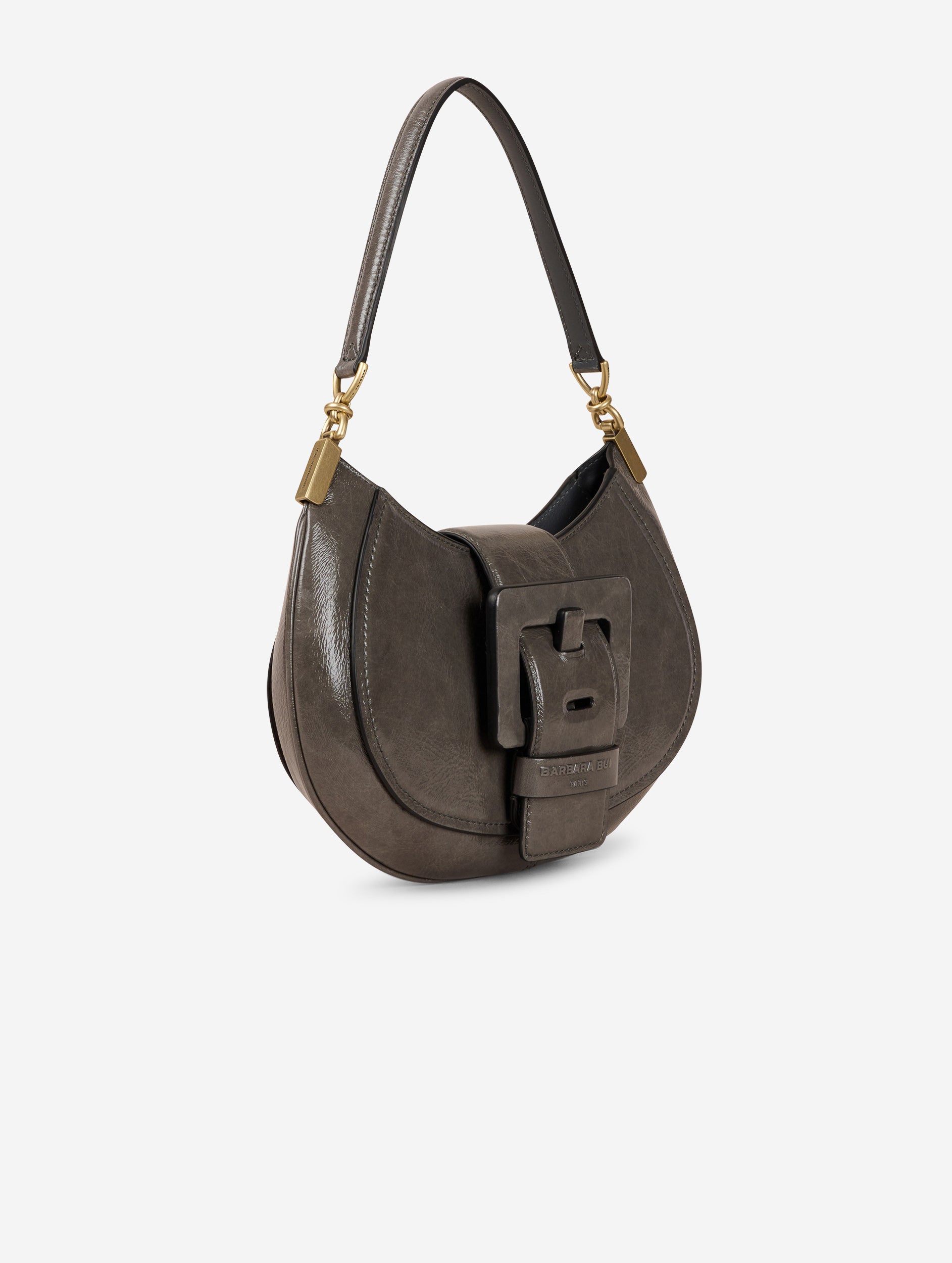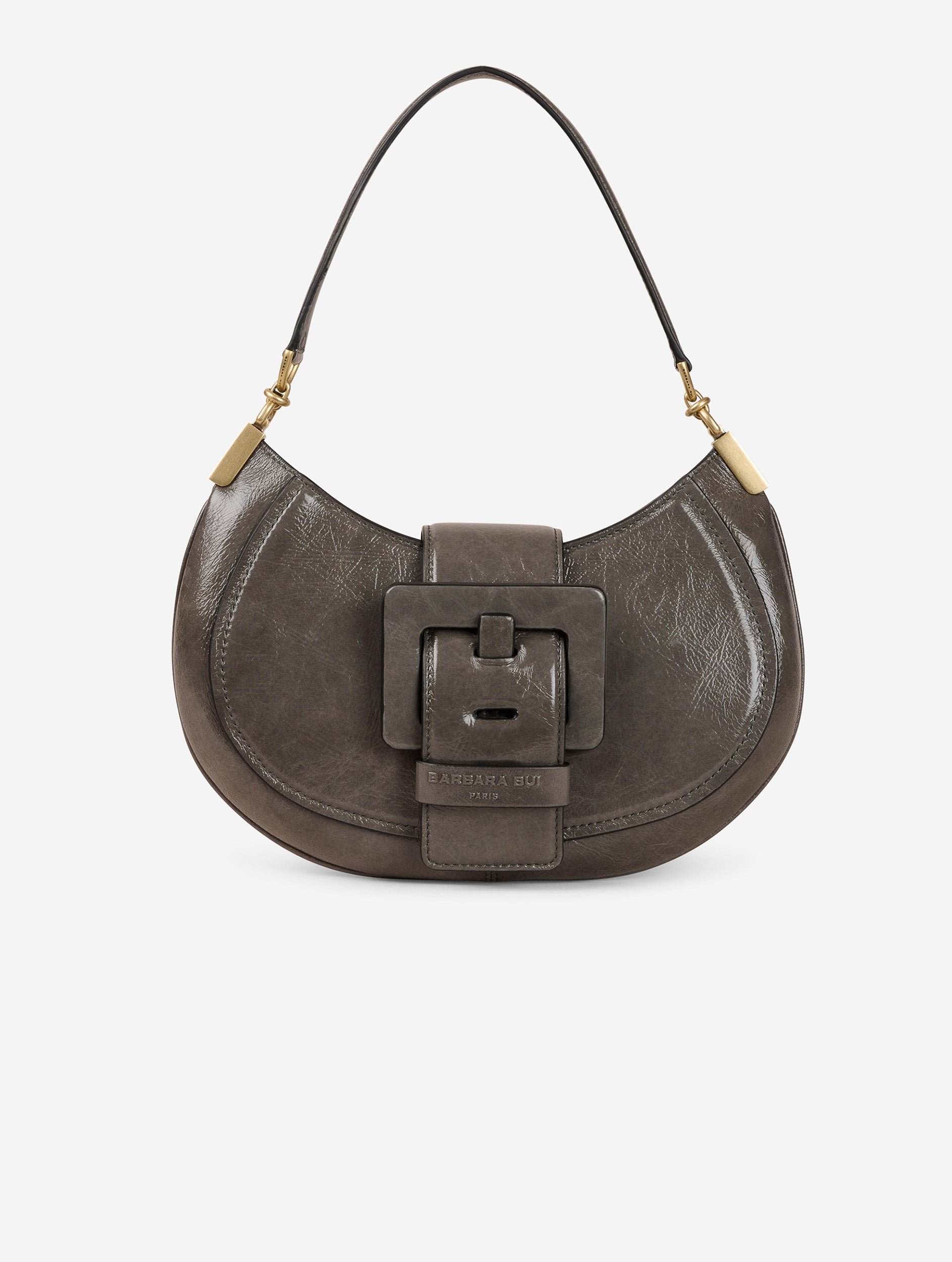 Sac "KISS ME" en cuir verni naplak gris. Zippé sur le dessus, la ceinture à fermeture magnétique forme un rabat. Il est habillé de la maxi boucle en cuir renforcé, signature de notre ligne de sacs "ME". Poignée-bandoulière pour un porter main ou petite épaule. Intérieur avec poche plaquée. Hauteur : 20 cm / Longueur : 28 cm / Profondeur : 8 cm.