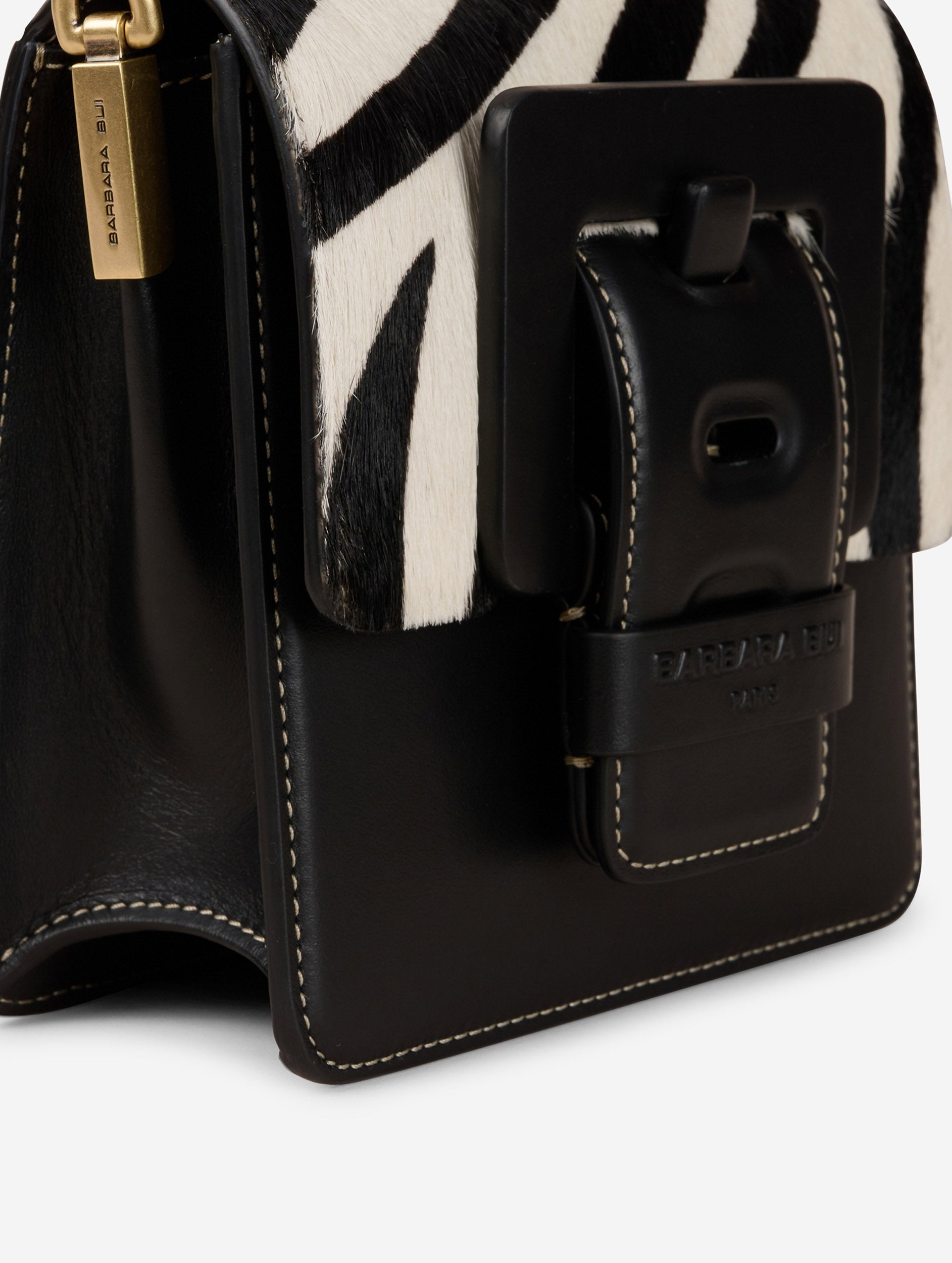 Sac "LOVE ME" en cuir noir avec rabat en cuir façon poulain imprimé zèbre noir et blanc. Fine et longue bandoulière de 120 cm pour le porter croisé. Maxi boucle décorative en cuir noir renforcé sur le rabat à fermoir magnétique. Poche avant, poche dos idéale pour garder son smartphone sous la main, et poche intérieure passepoilée. Hauteur 16 cm / Longueur : 16 cm / Profondeur 6,5 cm.