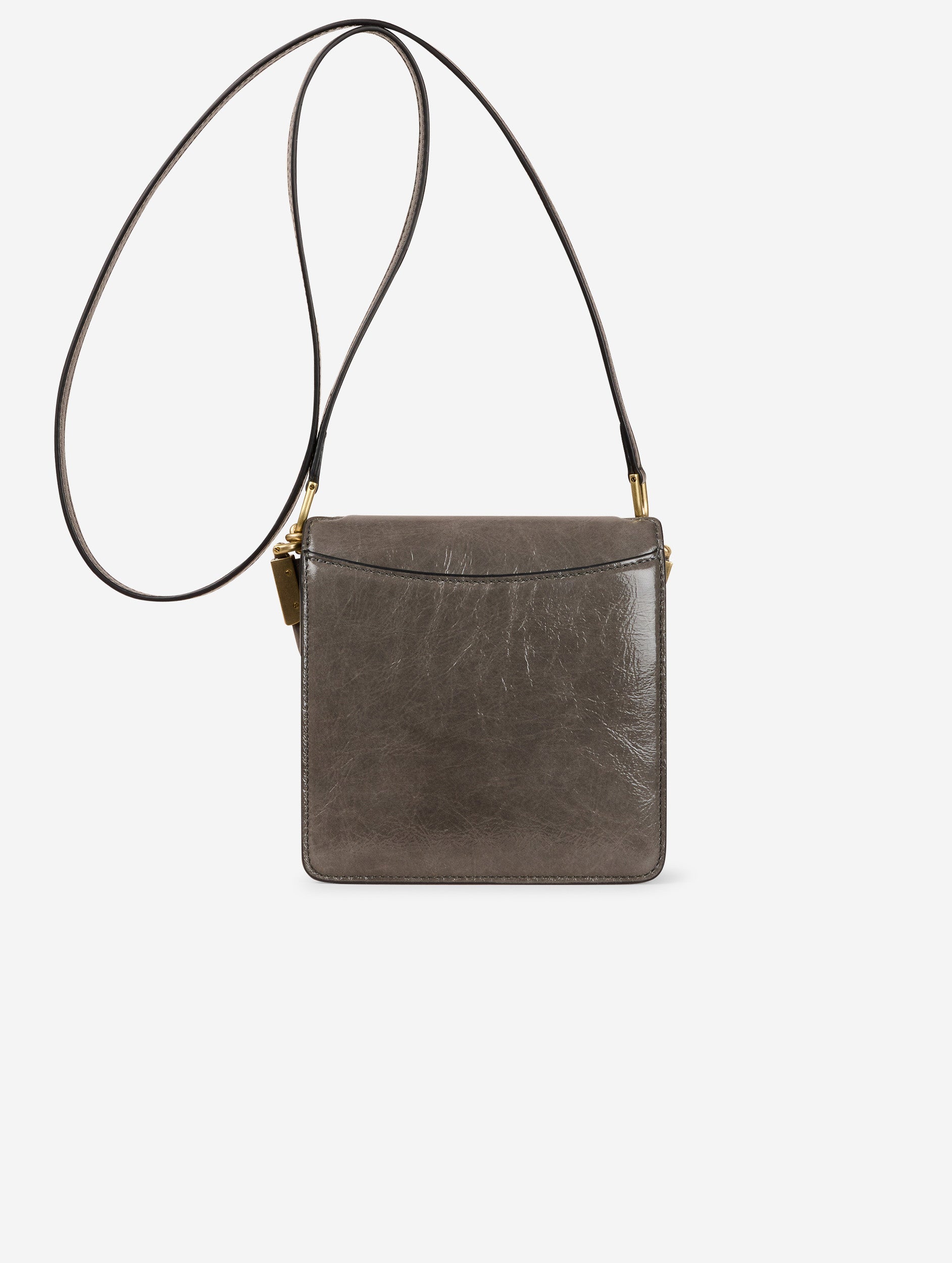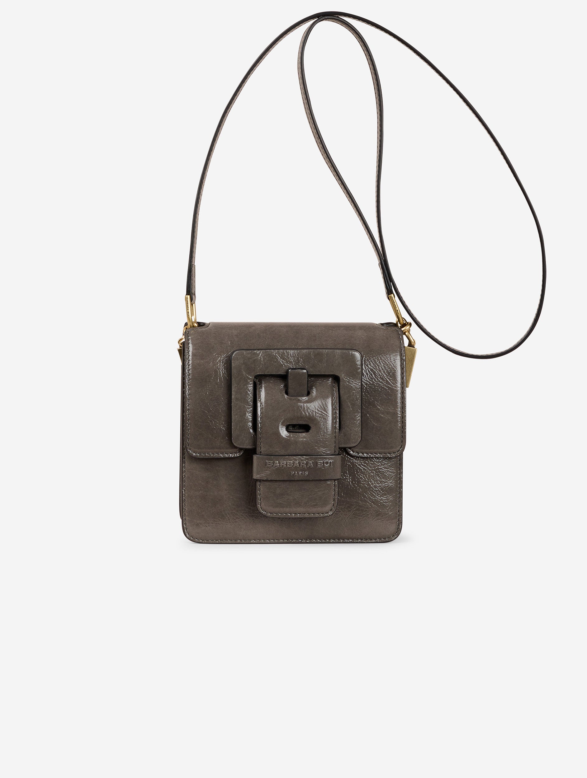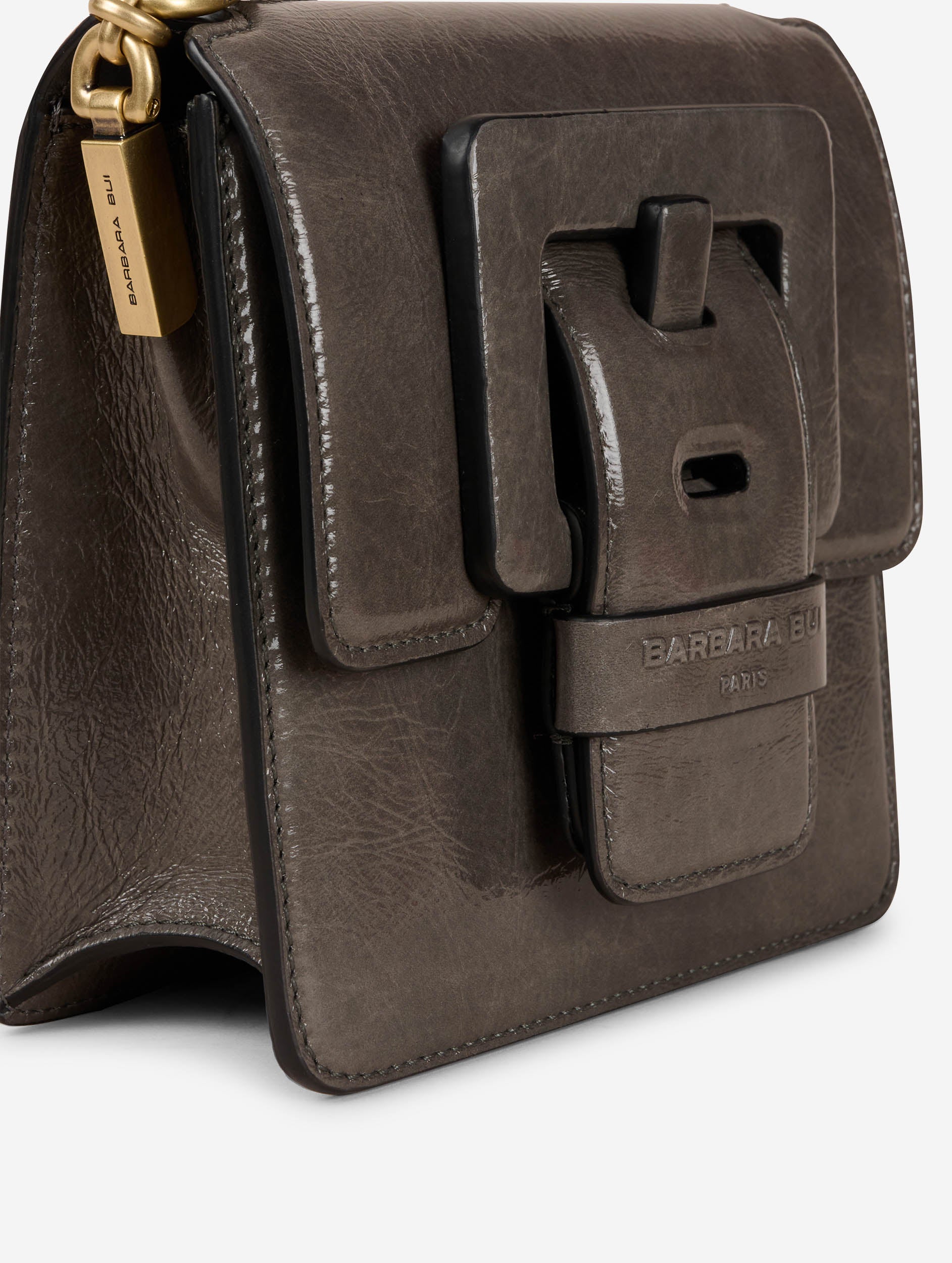 Sac "LOVE ME" en cuir verni naplak gris. Fine et longue bandoulière de 120 cm pour le porter croisé. Maxi boucle décorative en cuir renforcé sur le rabat à fermoir magnétique. Poche avant, poche dos idéale pour garder son smartphone sous la main, et poche intérieure passepoilée. Hauteur 16 cm / Longueur : 16 cm / Profondeur 6,5 cm.