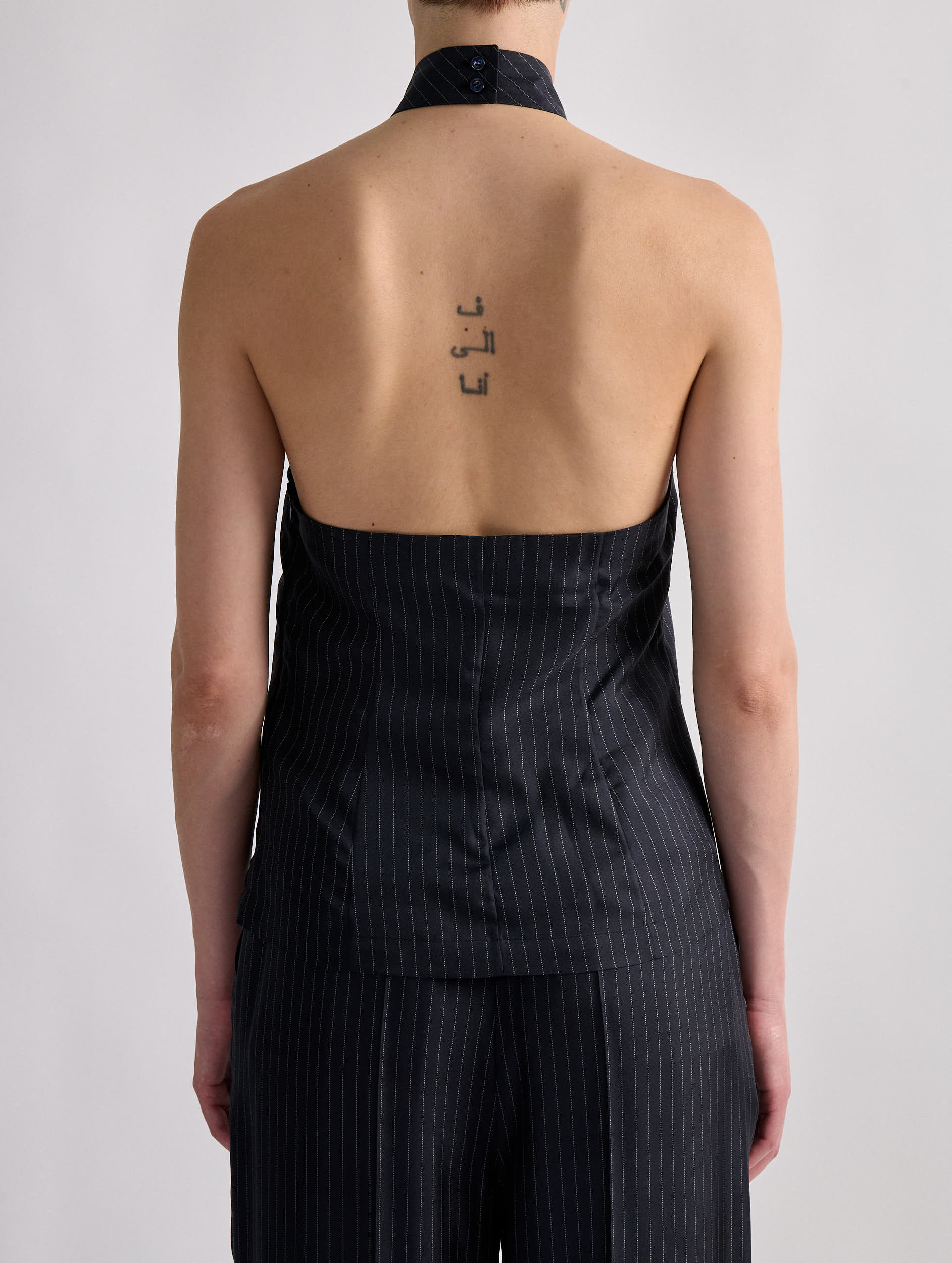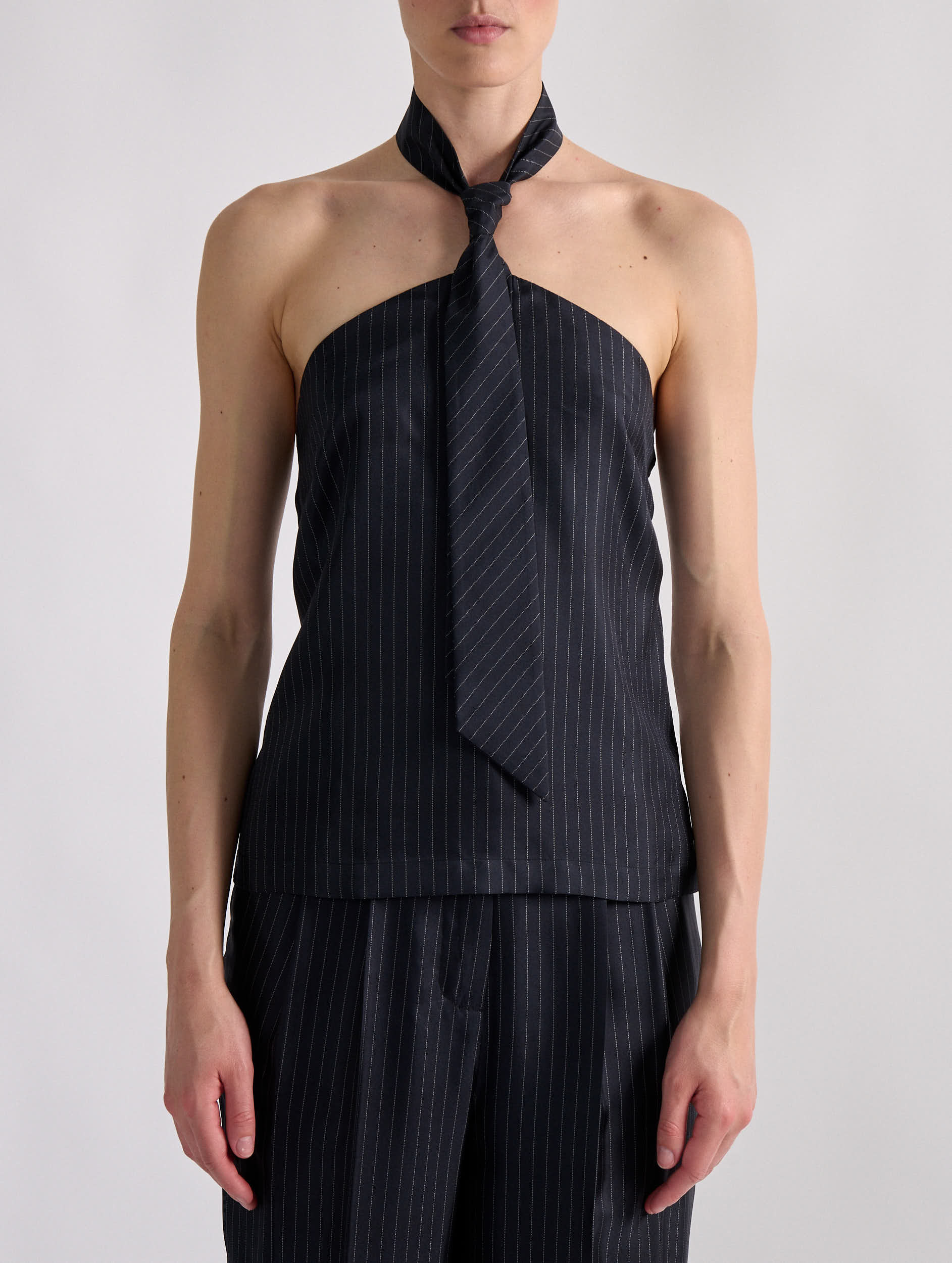 Incarnation du mélange des genres cher à Barbara Bui, ce top en soie comporte une cravate intégrée pour une allure androgyne qui ne manque pas de féminité. Retenue par un petit col doté de 2 boutons, ce top révèle un dos nu à la sensualité affirmée. La soie marine rayée s'inspire des costumes italiens auxquels elle prête sa douceur et sa fluidité. Porté en total look avec le pantalon et la veste de costume assortis, ce top cravate signe une allure "sharp and cut", du jour au soir.