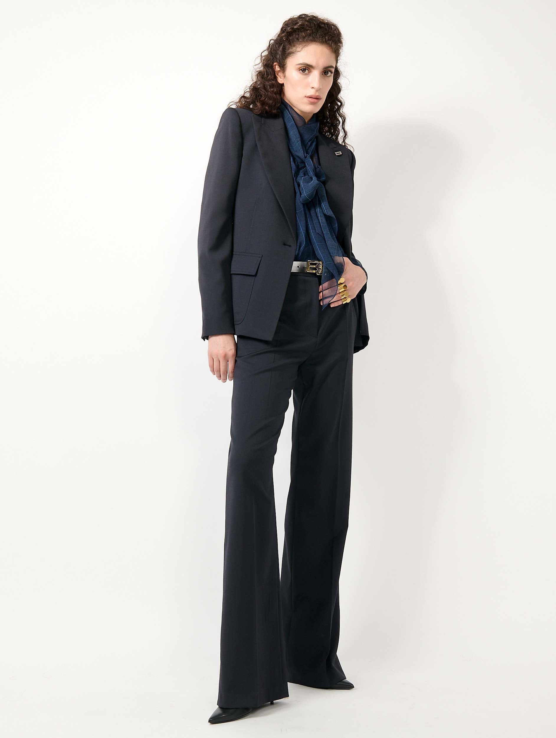 Cette veste de costume femme se dote d'un col prononcé, habillé d'un passant bijou, qui structure impeccablement la silhouette. Réalisée dans une confortable gabardine de laine stretch, cette veste cintrée aux manches discrètement agrémentées d'un zip met en valeur l'art de la coupe de la Maison et le soin porté aux finitions de son vestiaire sartorial. Elle peut se porter en costume, associée au pantalon taille haute et jambes large coordonné. Un intemporel proposé en navy ou sable.