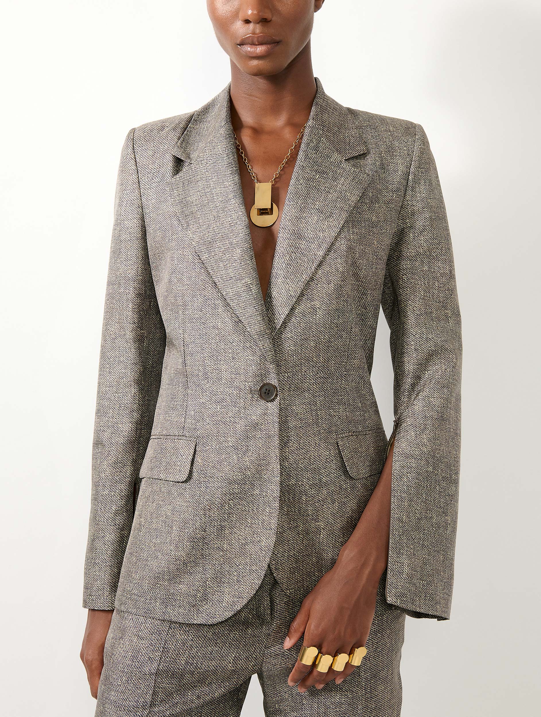 Réalisée dans une soie à l'imprimé trompe-l'œil façon tissage en lin, cette veste au col prononcé signe une silhouette élégante, du jour au soir. Les nuances subtiles du motif, rehaussées par le support en soie, rappellent les costumes masculins tout en s’inscrivant dans une veine indéniablement féminine. Ses manches zippées s'ouvrent pour révéler la chemise coordonnée accessoirisée de sa cravate, épicentre de l'allure boyish du tailoring Barbara Bui.