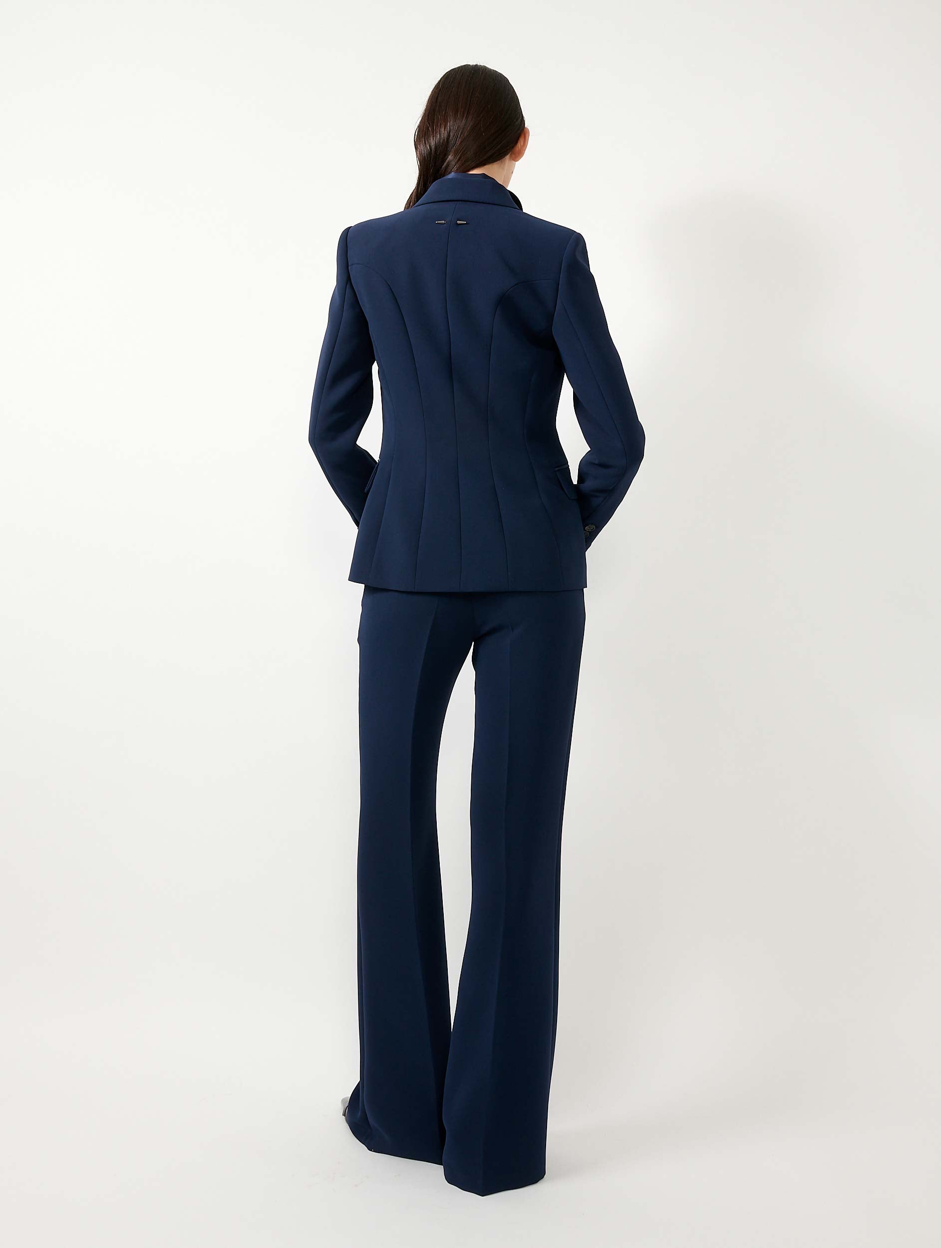 La veste est le territoire d'expression privilégié de Barbara Bui, mêlant références au tailoring masculin et féminité. Cette veste de costume en crêpe navy se dote d'un col smoking en satin ton sur ton accessoirisé d'une milanaise en métal argenté. Grâce à d'astucieuses et discrètes ouvertures zippées, ses manches s'ouvrent sur le poignet d'une chemise en satin bleu nuit. Pour une soirée ou un évènement festif, coordonnez cette veste de smoking à son pantalon à la ceinture en satin.